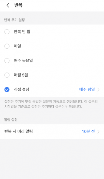 주기를 설정한 이후에도 설문이 필요 없는 날에는 반복을 취소할 수도 있습니다.