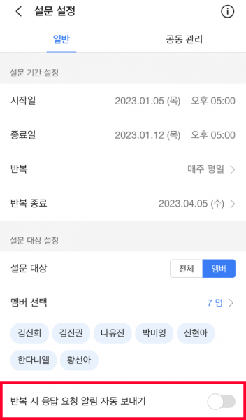 반복 주기를 선택한 후 '반복 시 응답 요청 알림 자동 보내기' 설정을 켜보세요.