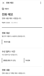 전화 대상과 수신 일자,시간이 포함된 전화 메모