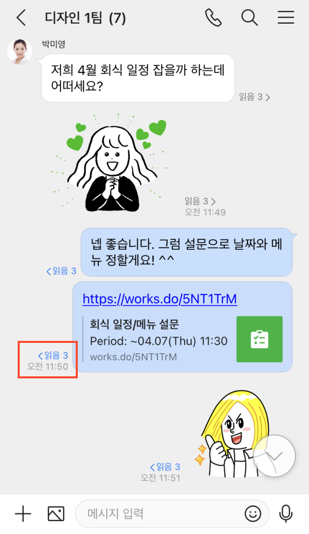메시지별로 읽음 여부를 확인해보세요.