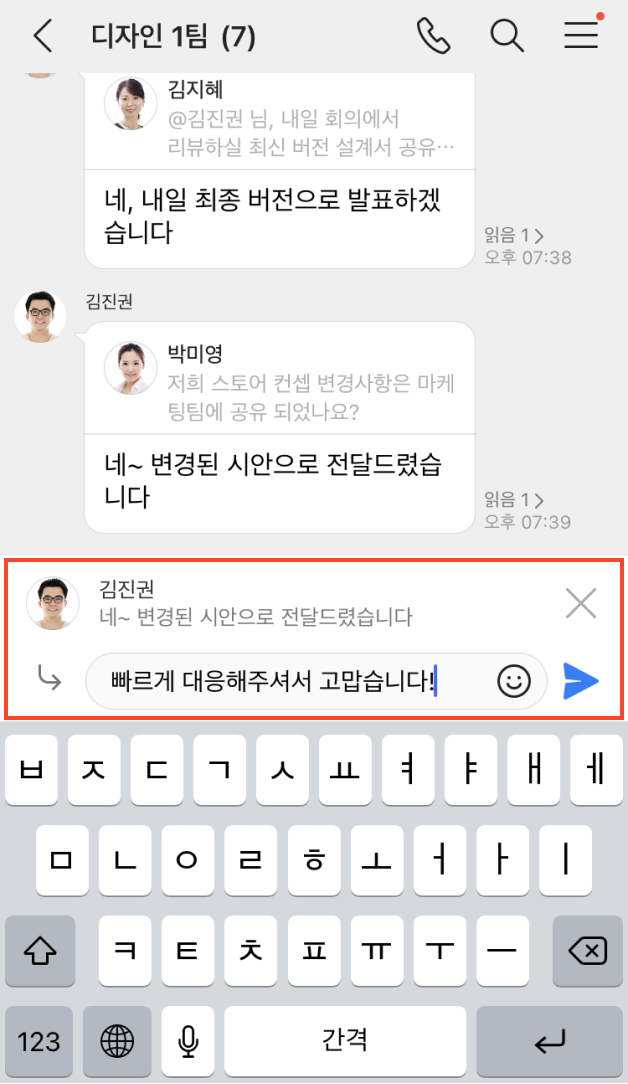 어떤 메시지에 대한 답장인지 표시되고, 해당 메시지로 바로 이동할 수 있어 대화의 맥락을 쉽게 파악할 수 있습니다.
