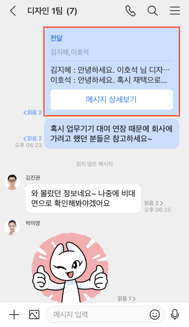 다른 메시지방 멤버에게 메시지를 공유하려면 메시지 전달 기능을 사용해보세요.