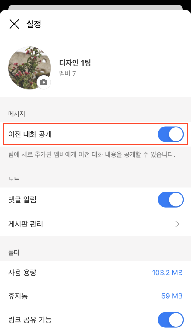 메시지방 설정에서 이전 대화를 공개해, 새로 초대받은 사람들이 빠르게 업무를 파악할 수 있도록 해보세요.