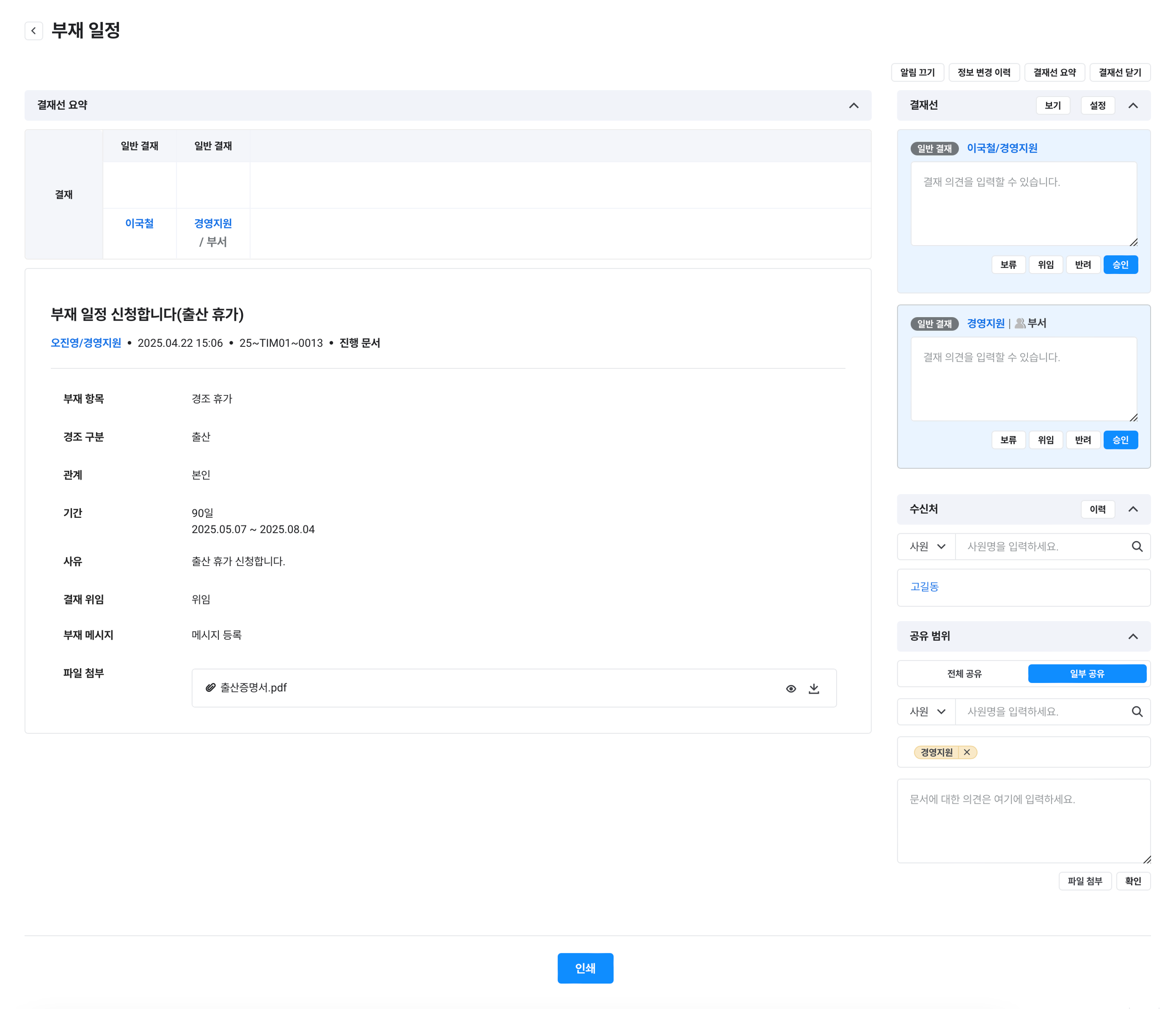 | 부재 일정 취소 | 제목, 사유, 파일 첨부 |