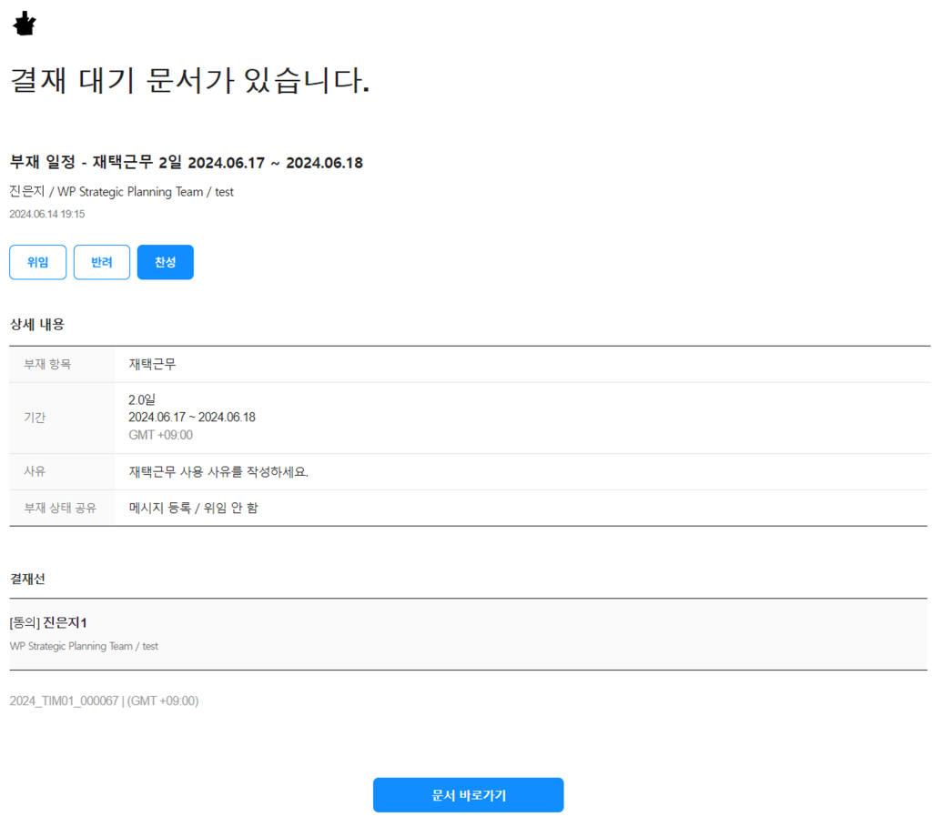 - 위임자에게 결재를 요청하는 알림 메일이 발송되고, 위임자 홈의 결재 문서 위젯의 '결재 대기' 영역에 결재 요청 알림이 표시됩니다.