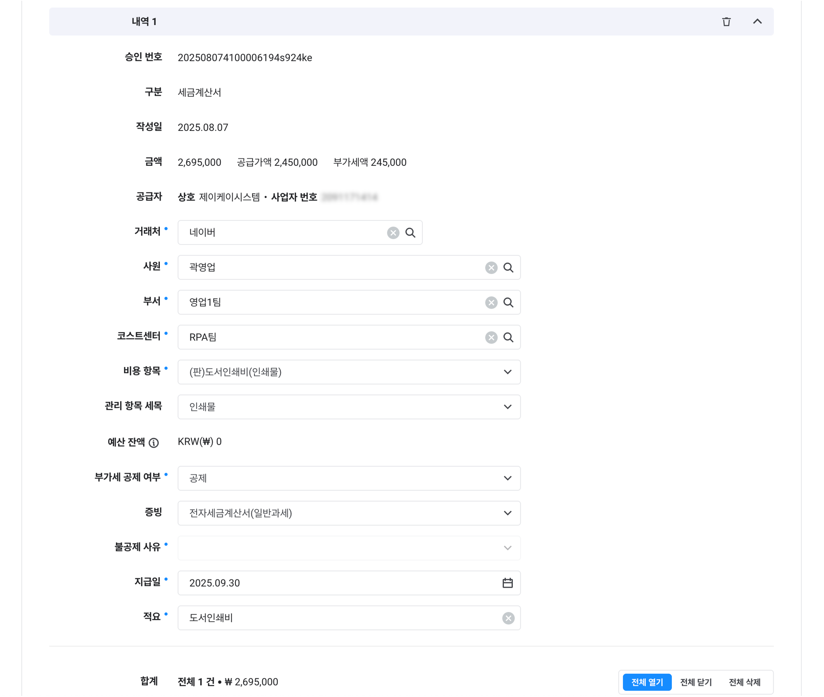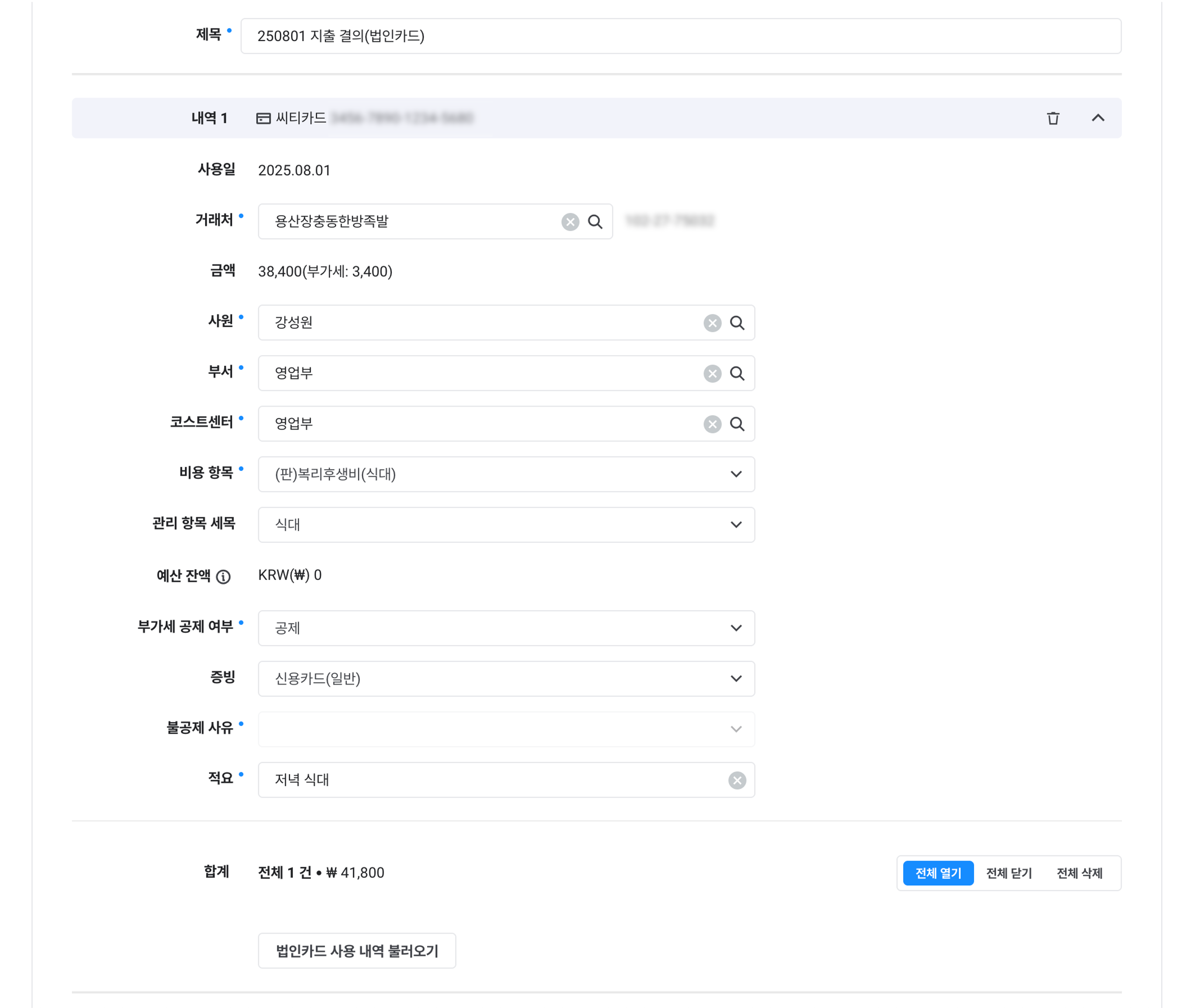제목, 예산, 지출 항목, 증빙 유형, 거래처, 계좌, 증빙일, 금액, 내용, 연관 문서 |