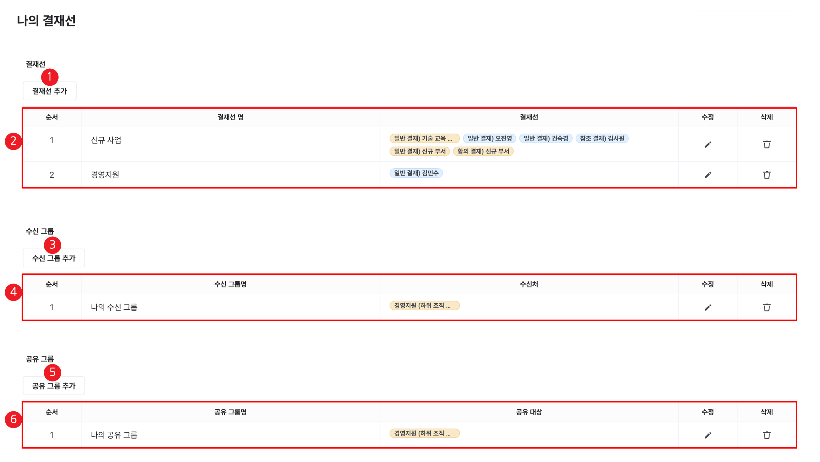 나의 결재선 화면은 다음과 같이 구성되어 있습니다.