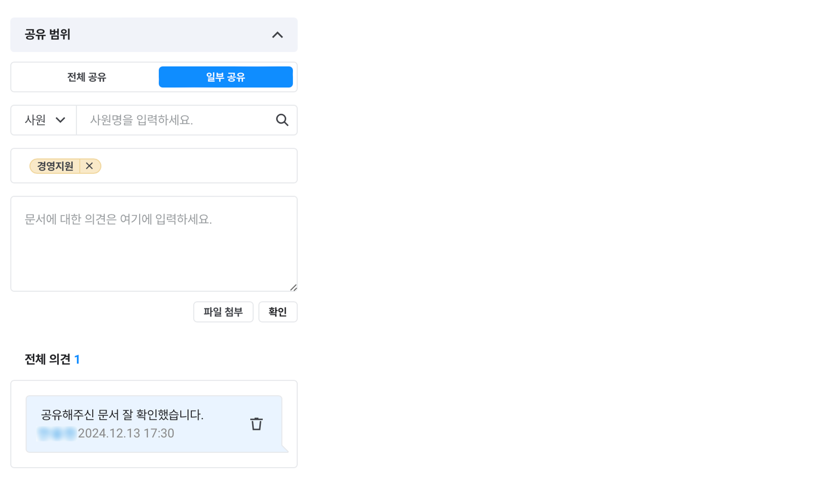 일부 공유 시 지정한 특정 대상자만 문서를 열람하고 공유 의견을 작성할 수 있습니다.