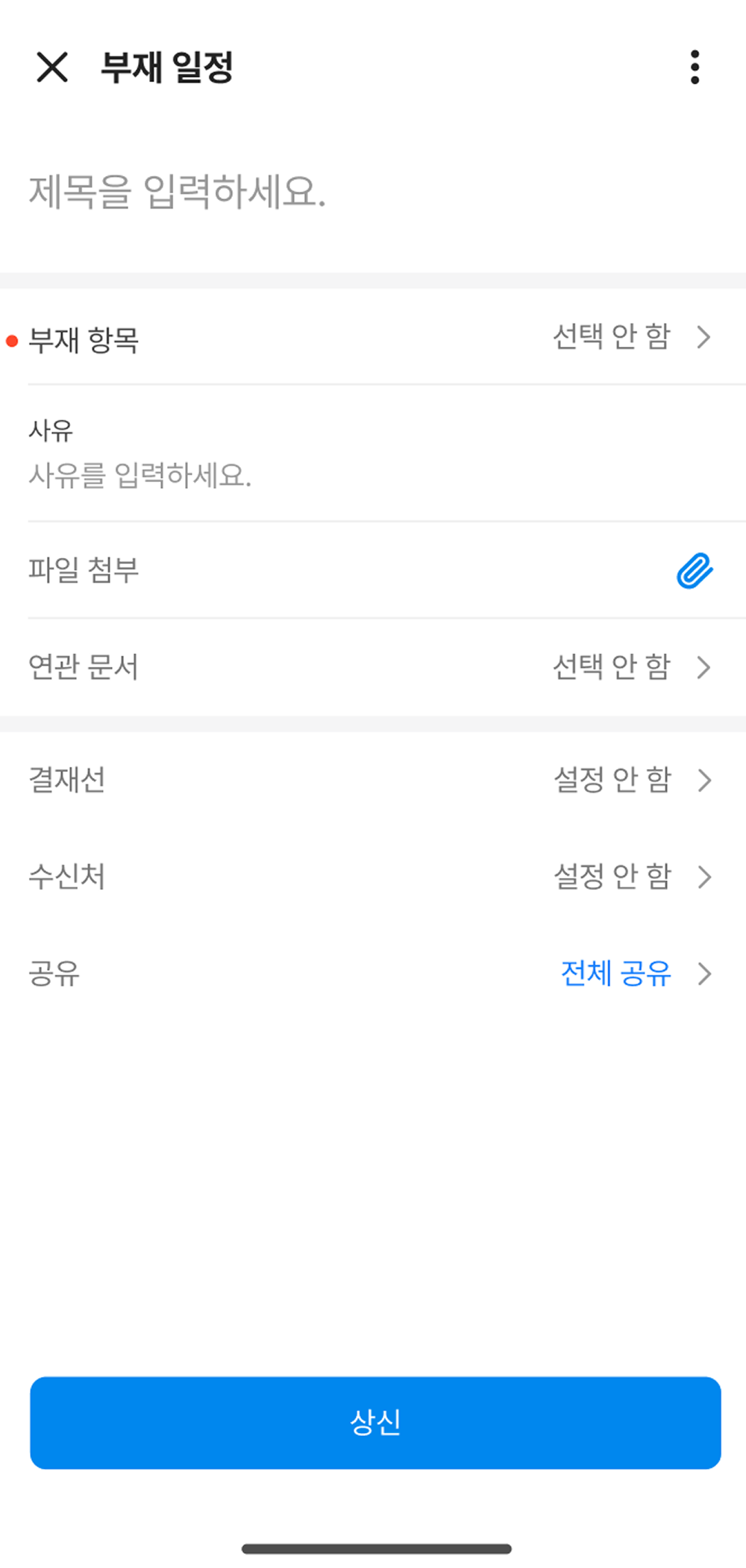 제목, 사유, 부재 상태 공유, 파일 첨부, 연관 문서(단, 제목 이외의 항목은 타 항목 변경으로 인해 초기화 시 유지 안됨) |