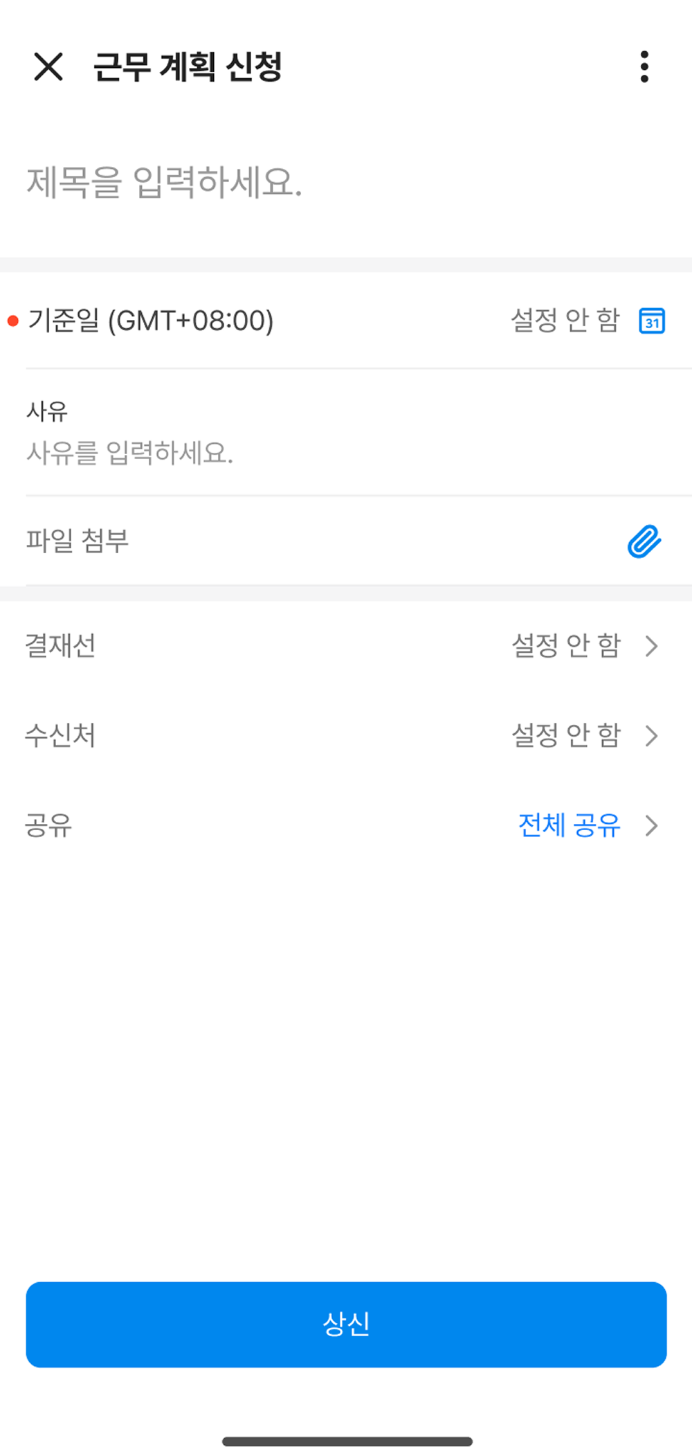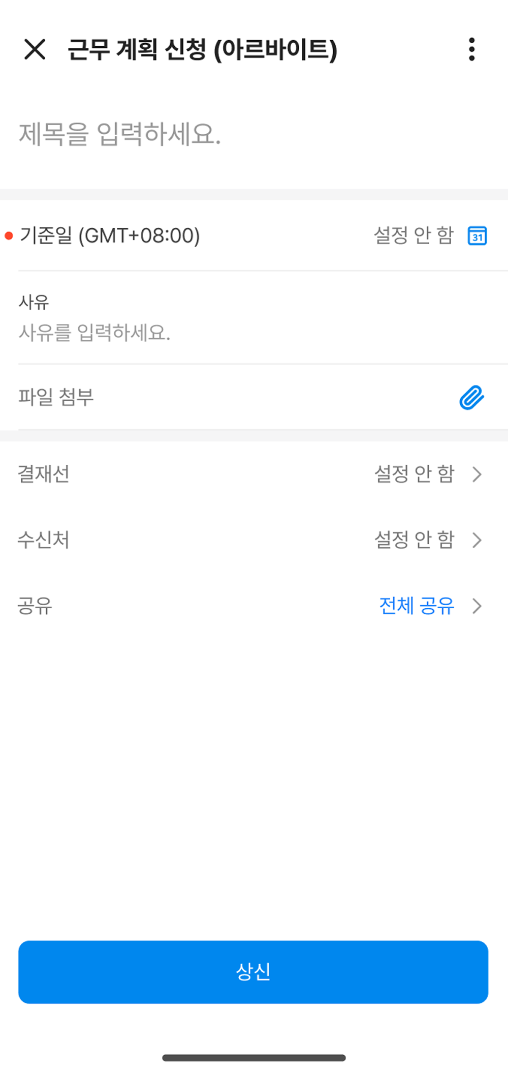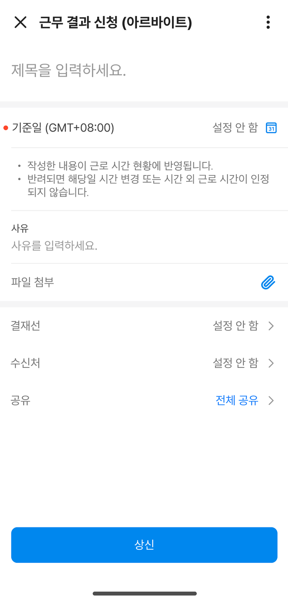 - '근무 일정 상신'을 적용받는 경우 해당 일의 근무 일정이 자동으로 표시되며, 다른 시간대를 선택할 수 없습니다.