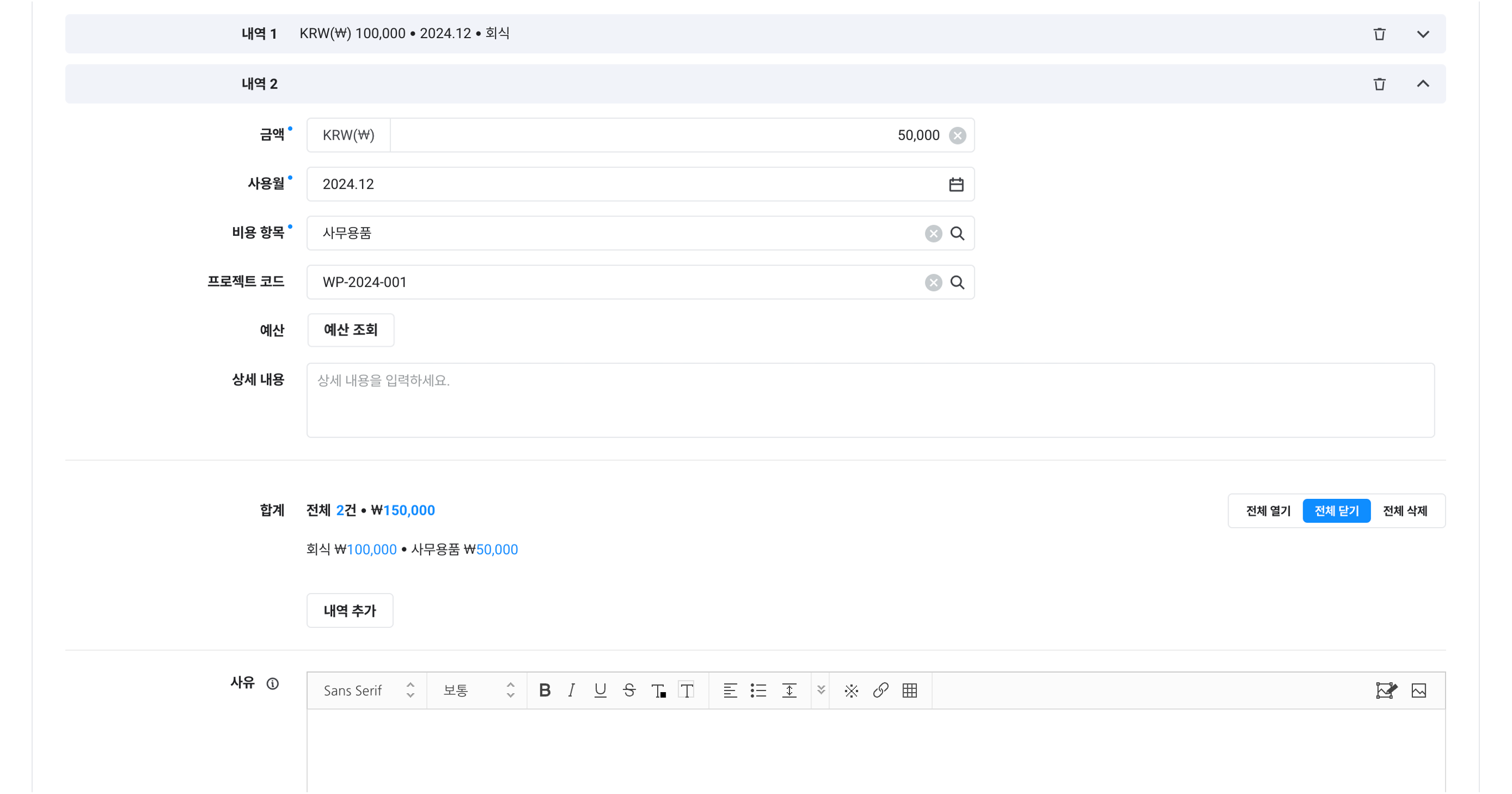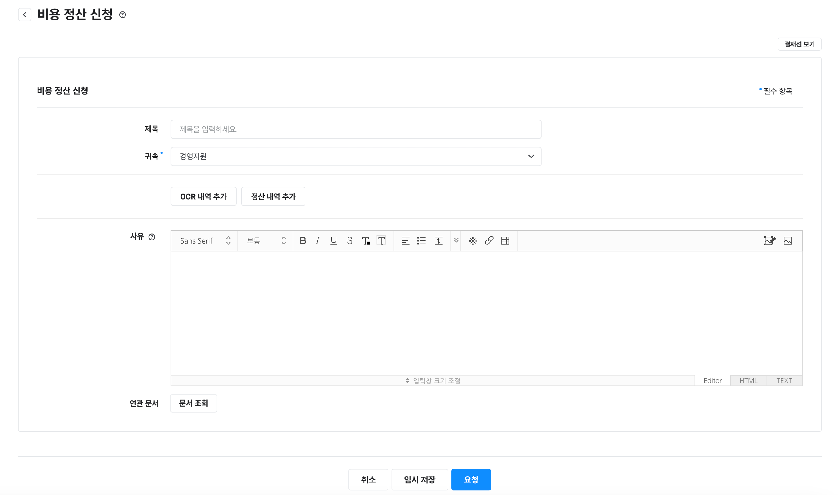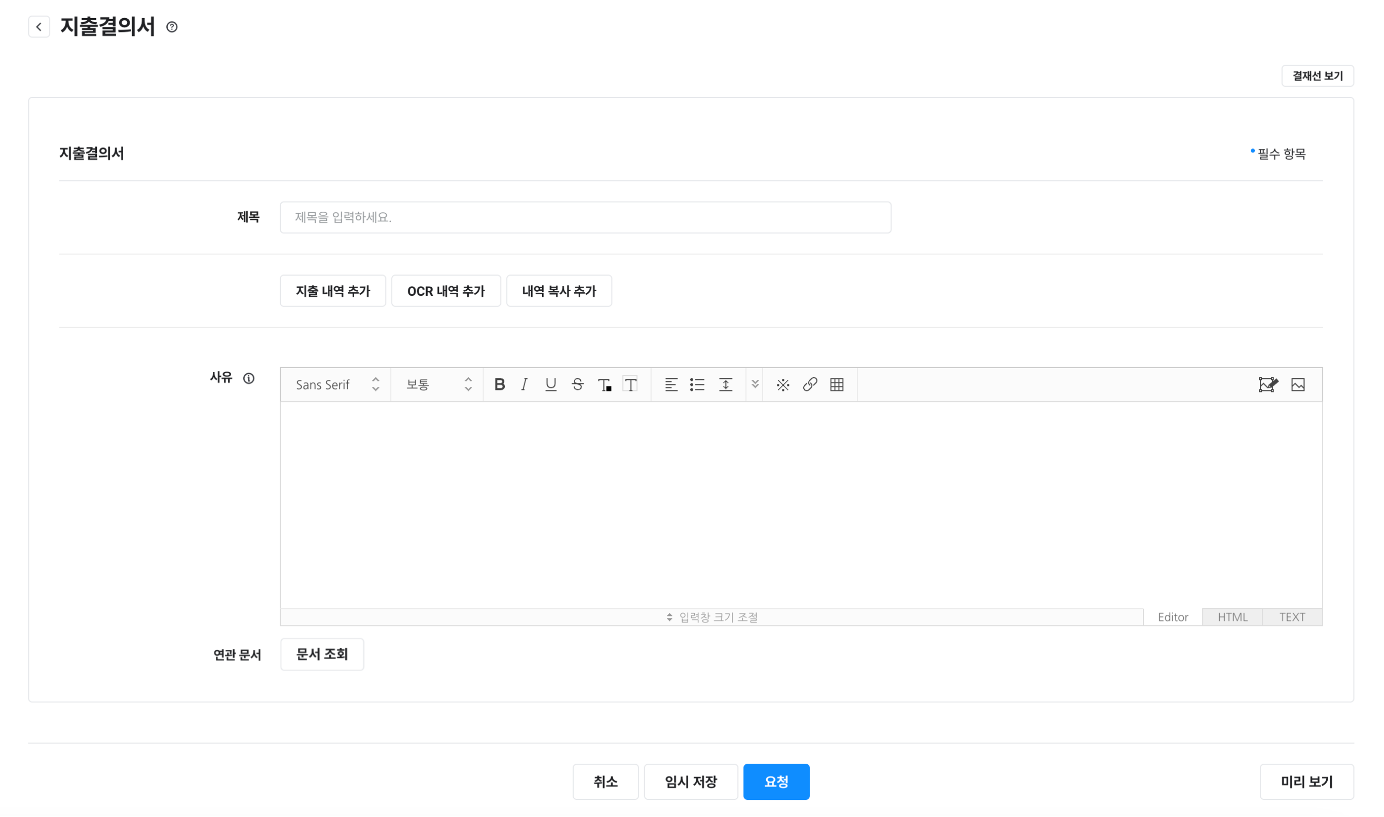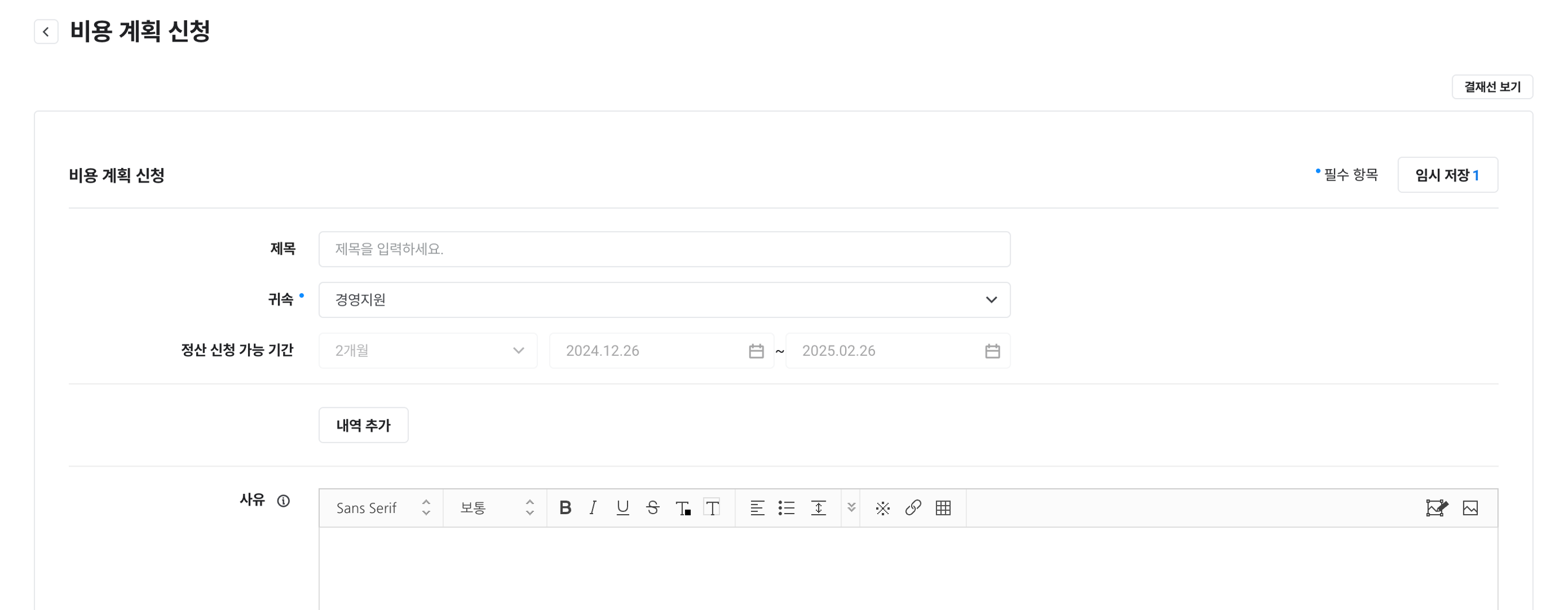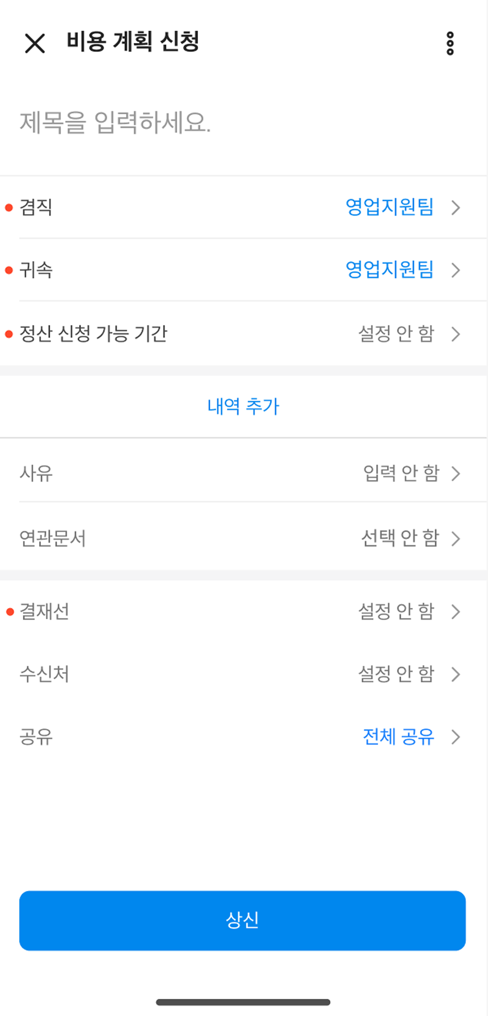 제목, 예상 일정, 금액, 상세 내용, 사유, 연관 문서 |