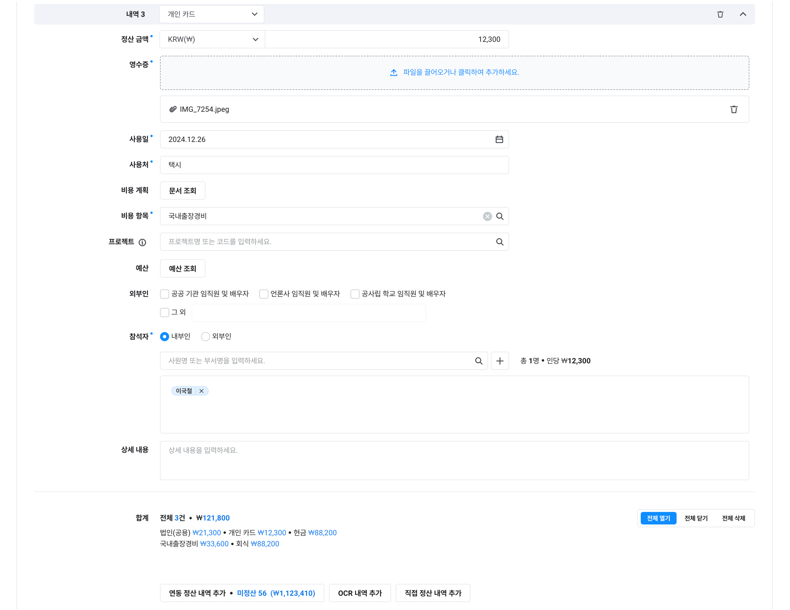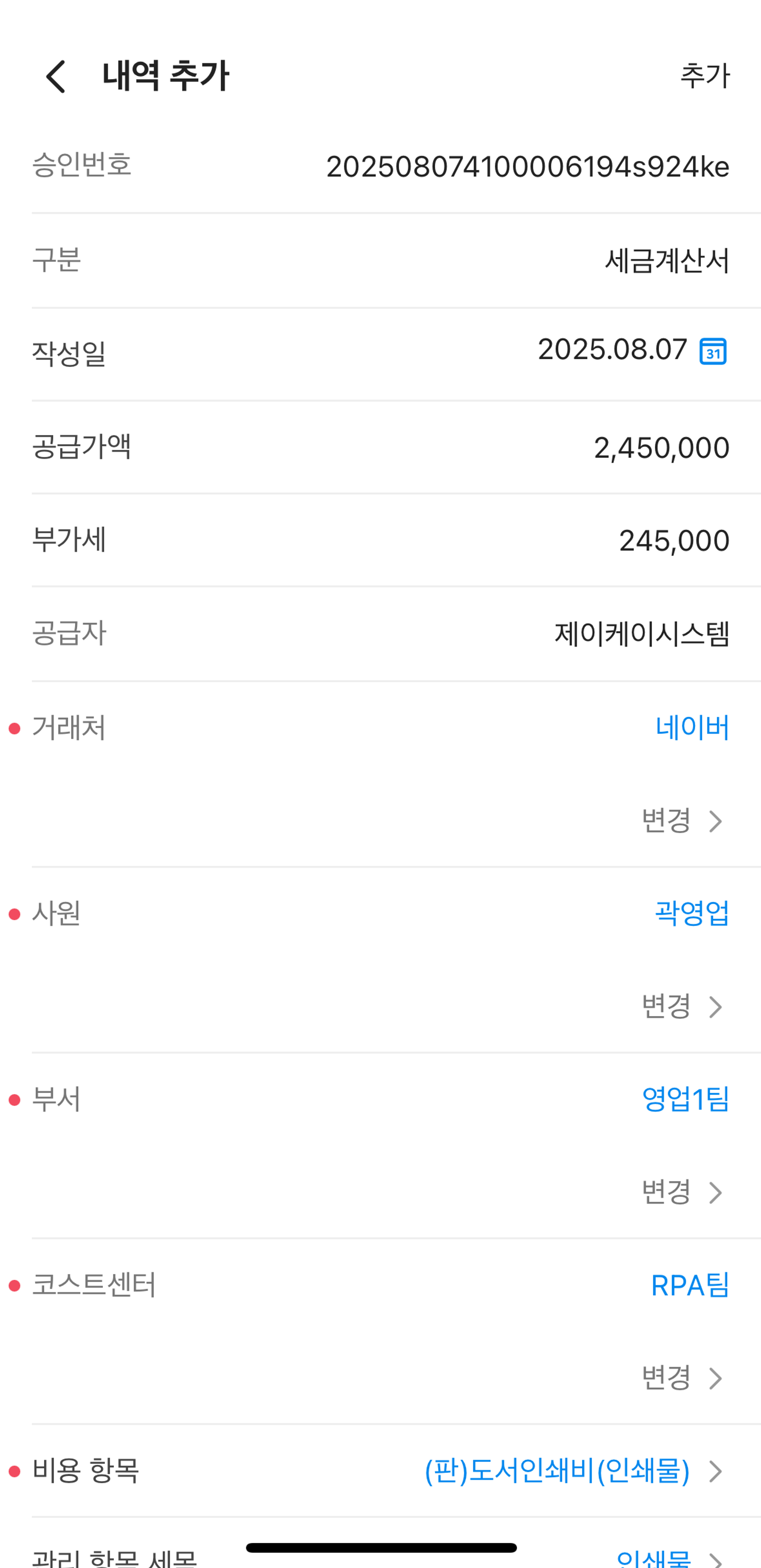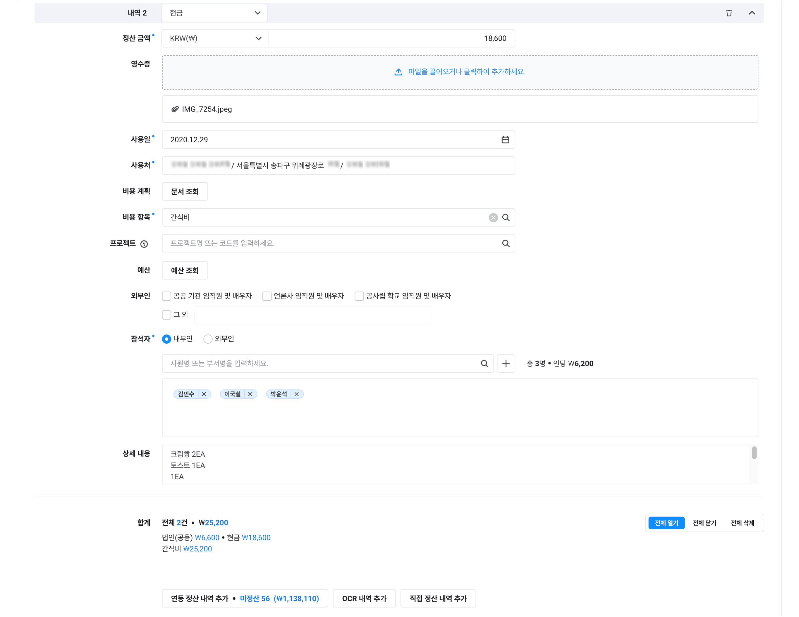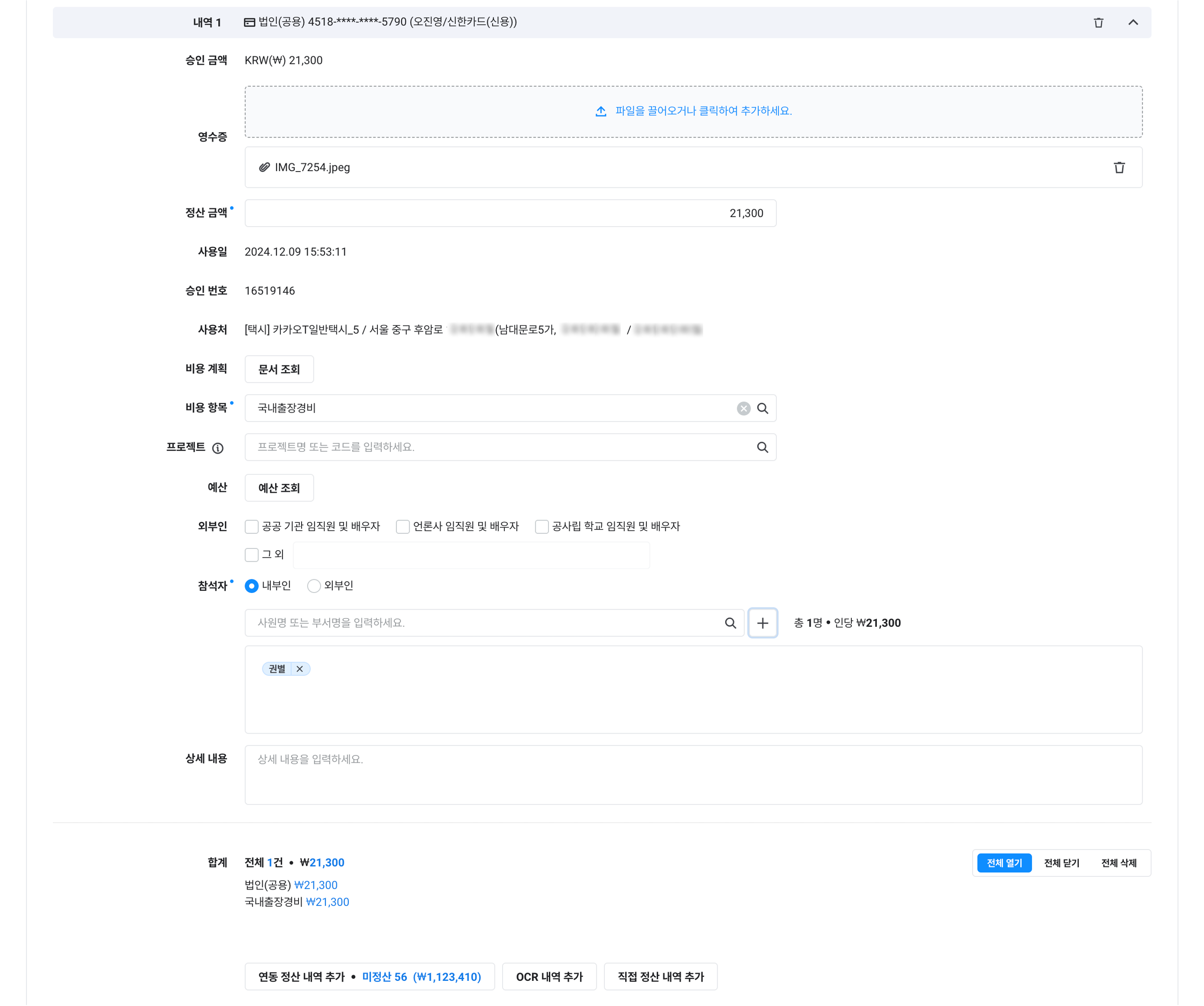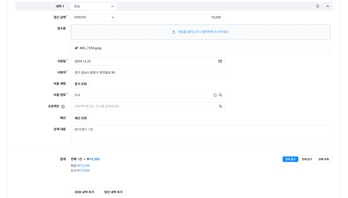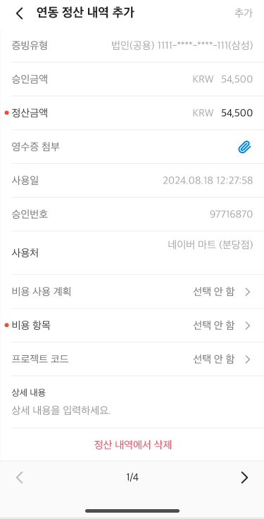 연동 정산의 추가 직접 정산: 증빙 유형, 정산 금액, 사용일, 사용처
