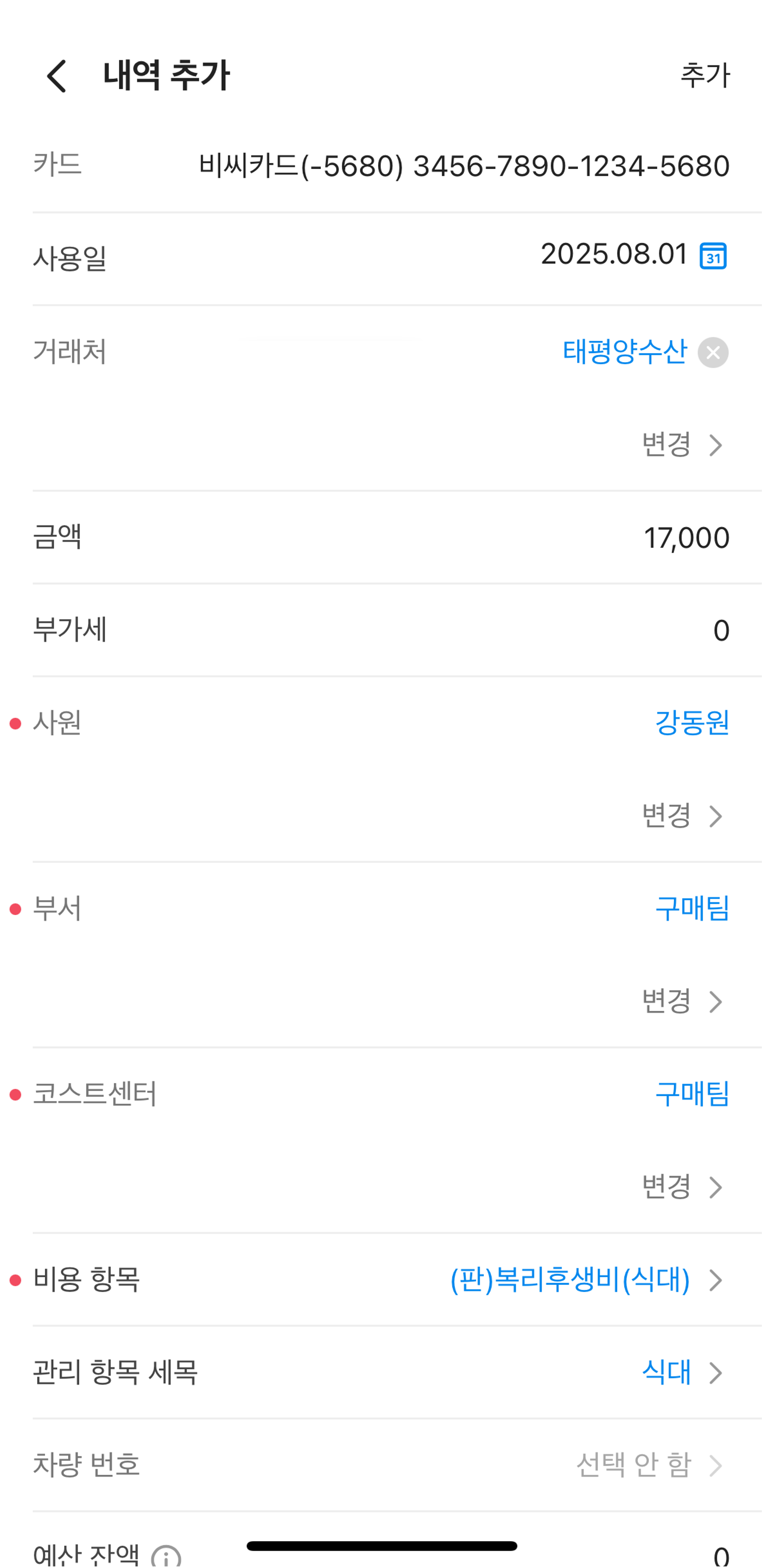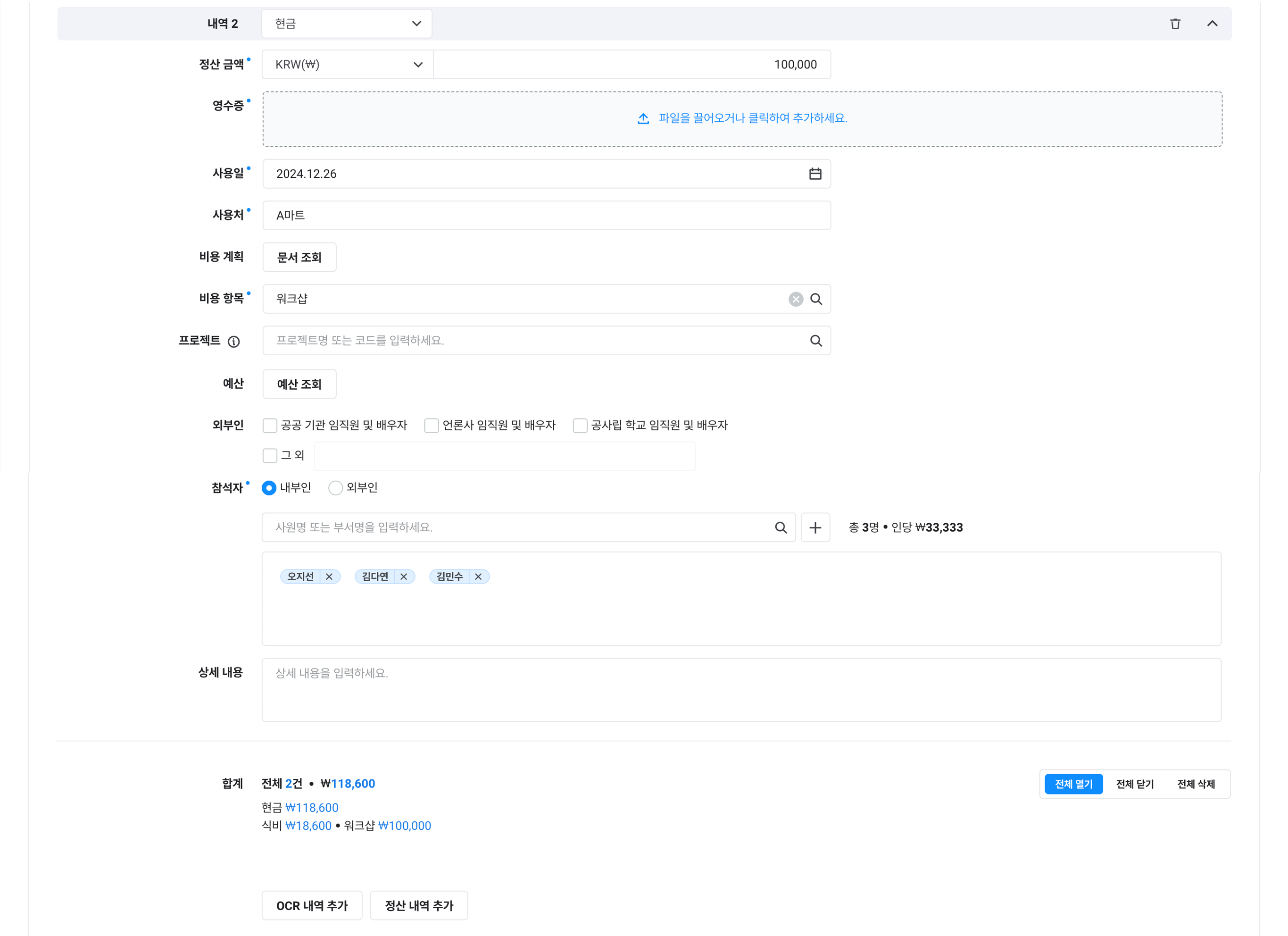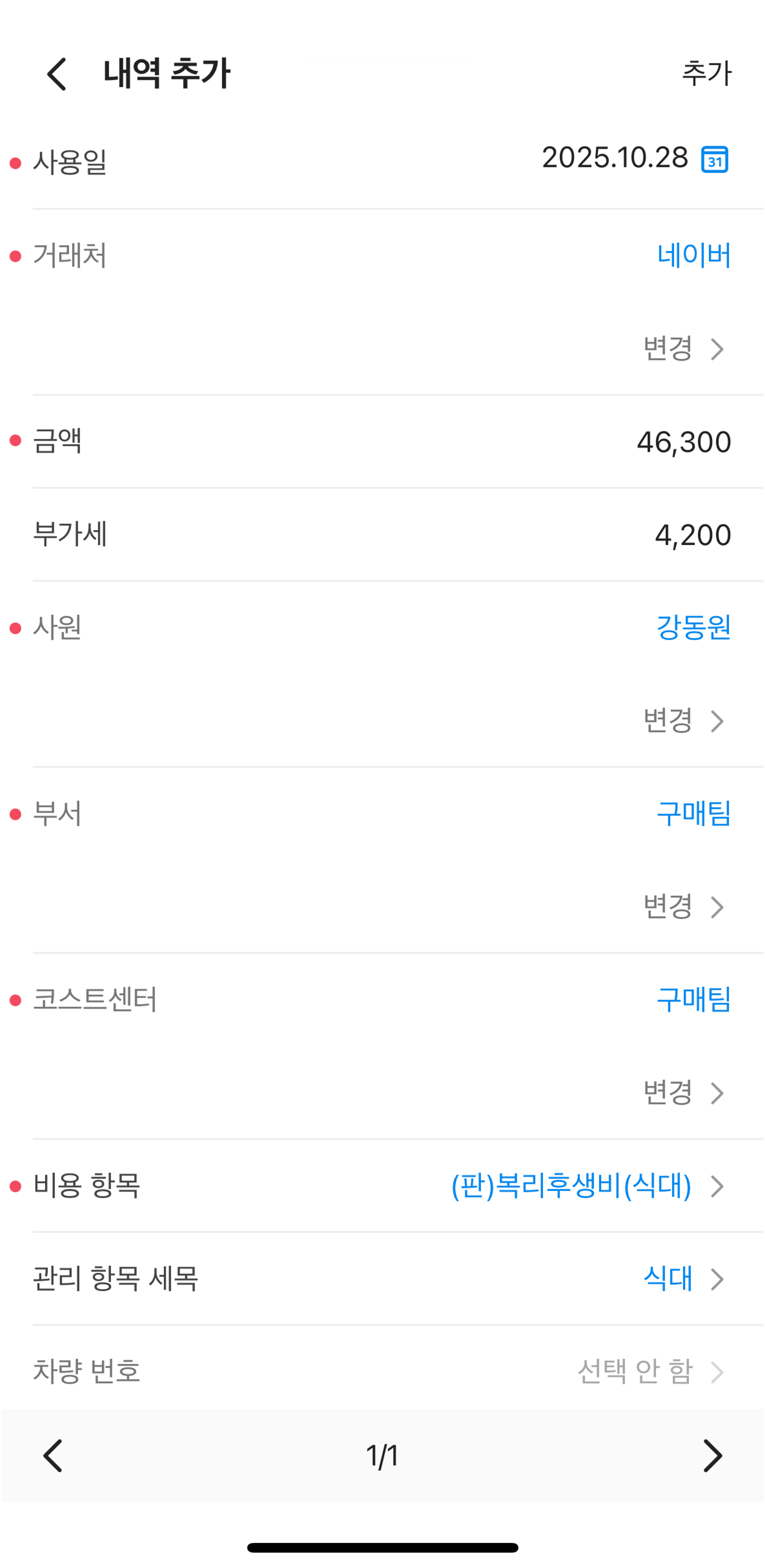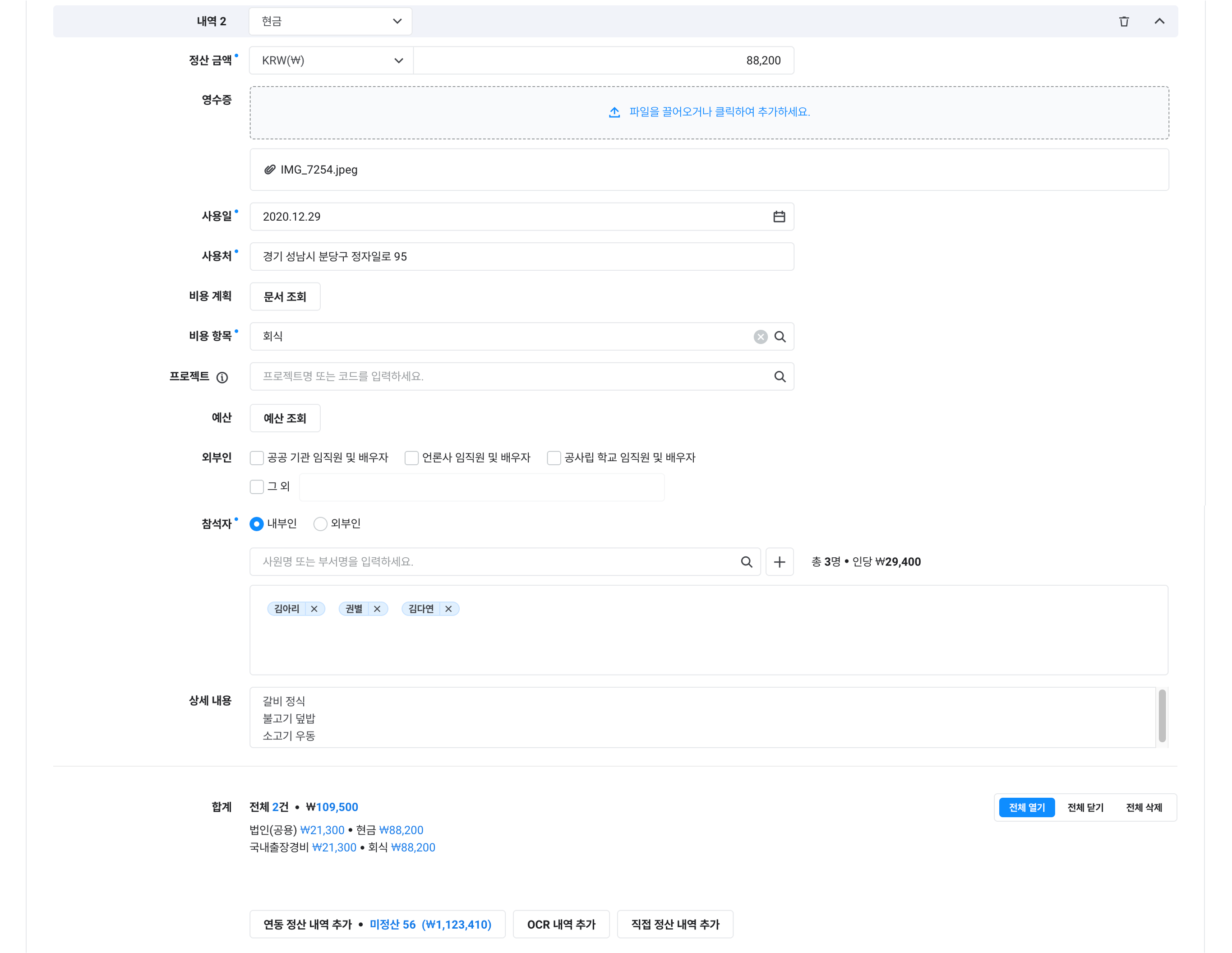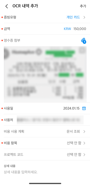 연동 정산의 추가 직접 정산: 증빙 유형, 정산 금액, 사용일, 사용처