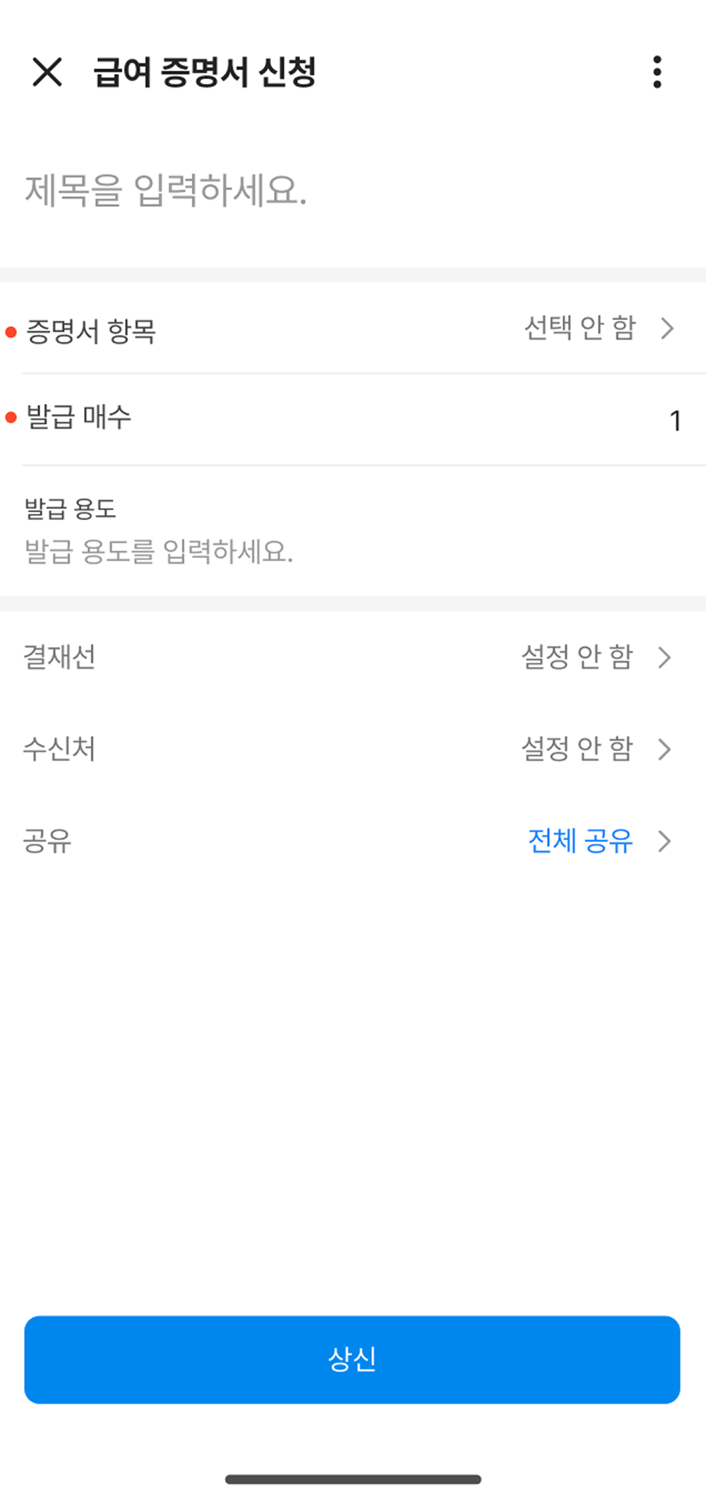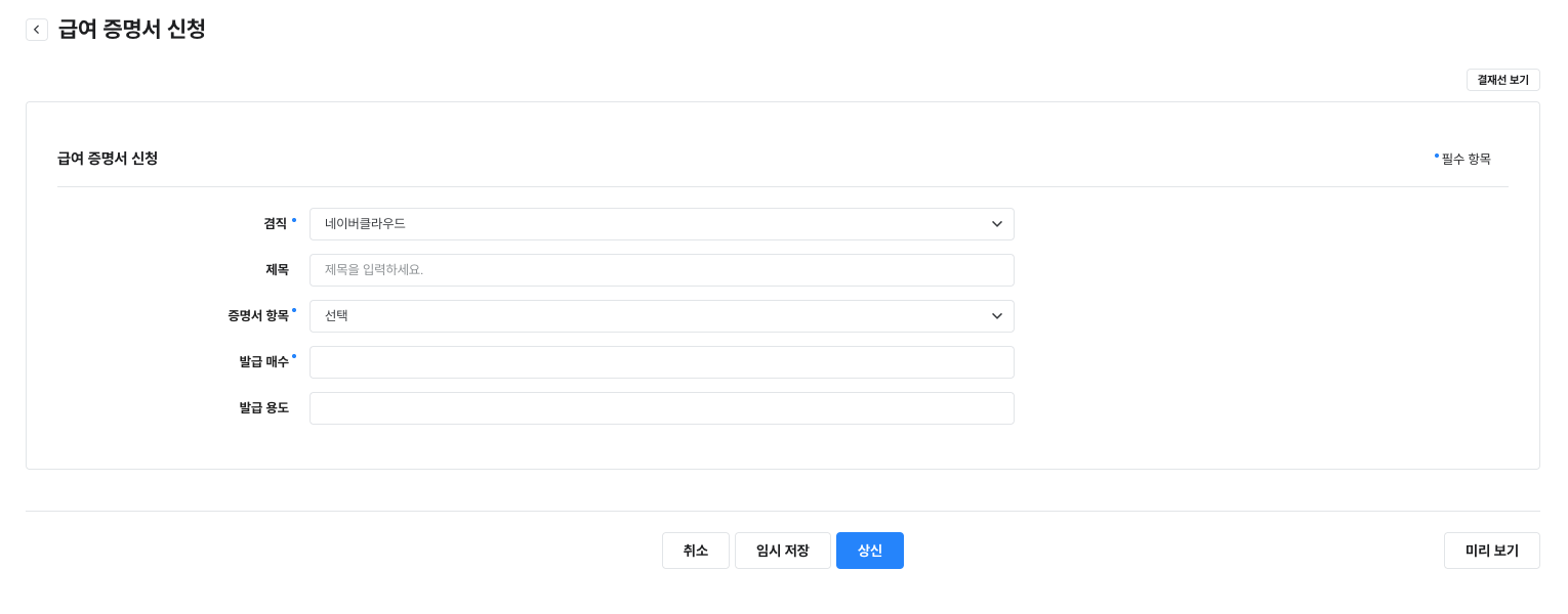 - 급여 증명서 신청 서식은 회사가 급여 서비스를 사용으로 설정한 경우에만 노출되는 서식입니다.