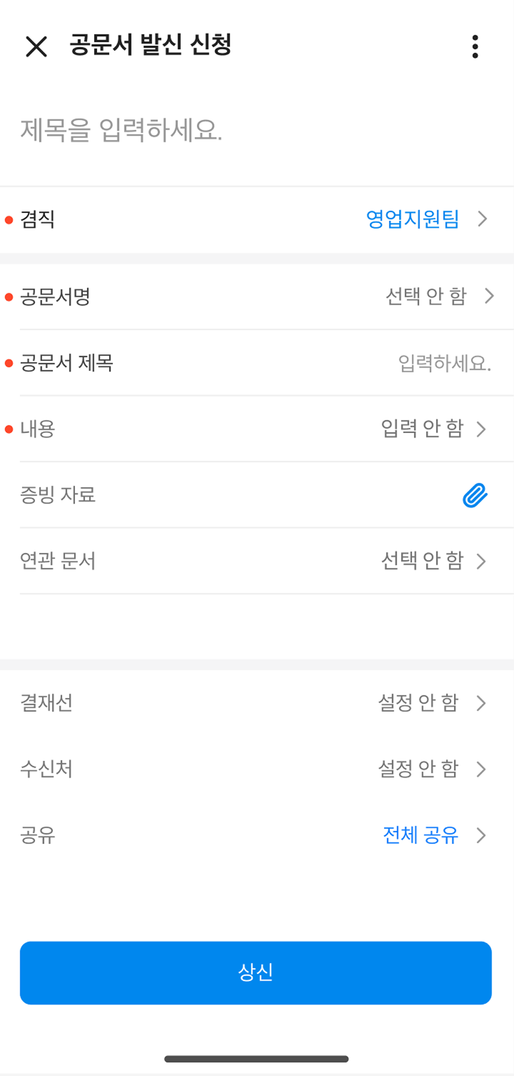 - 관리자가 서식의 결재선 필수 여부를 '필수'로 설정한 경우, 관리자 설정한 결재선이 없을 때 작성자는 반드시 결재선을 추가해야 문서를 상신할 수 있습니다.