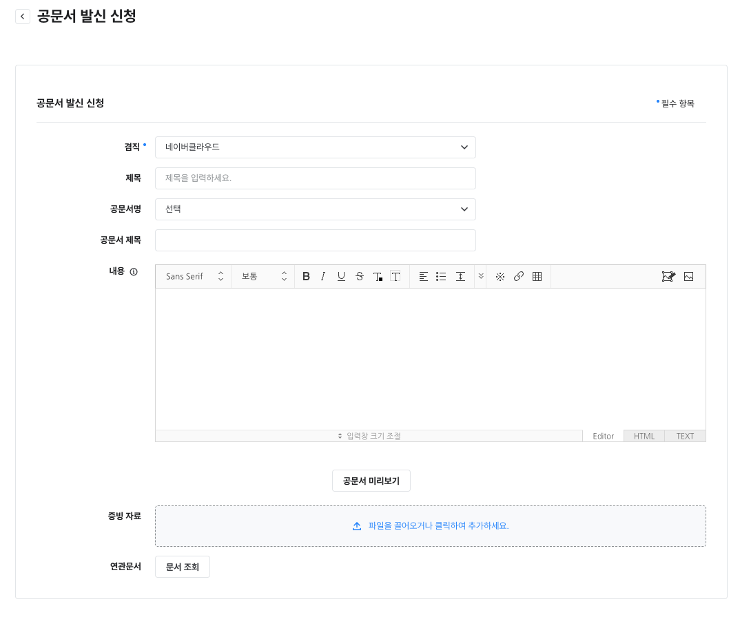문서 작성 화면은 다음과 같이 구성되어 있습니다.