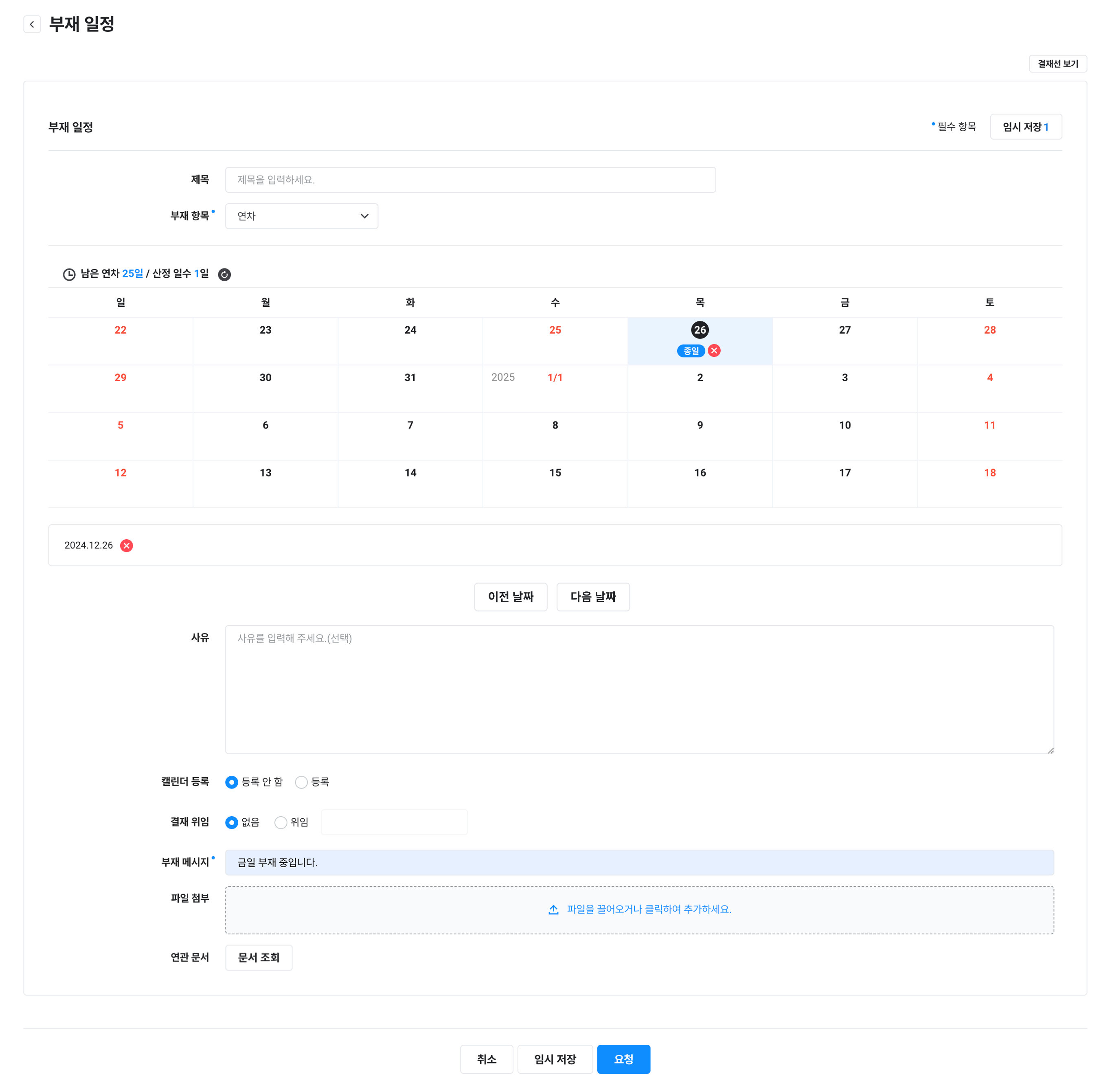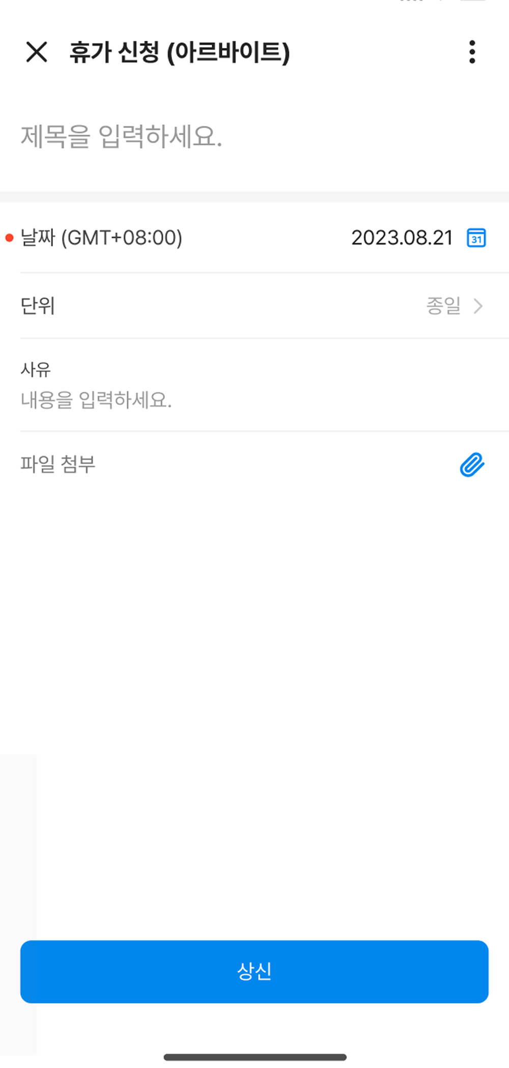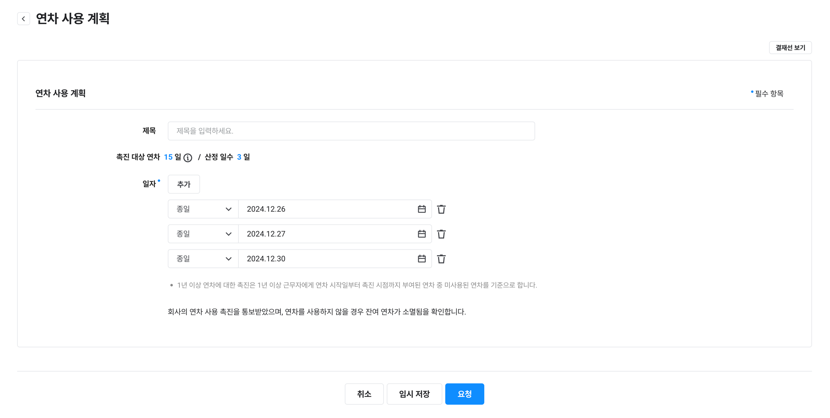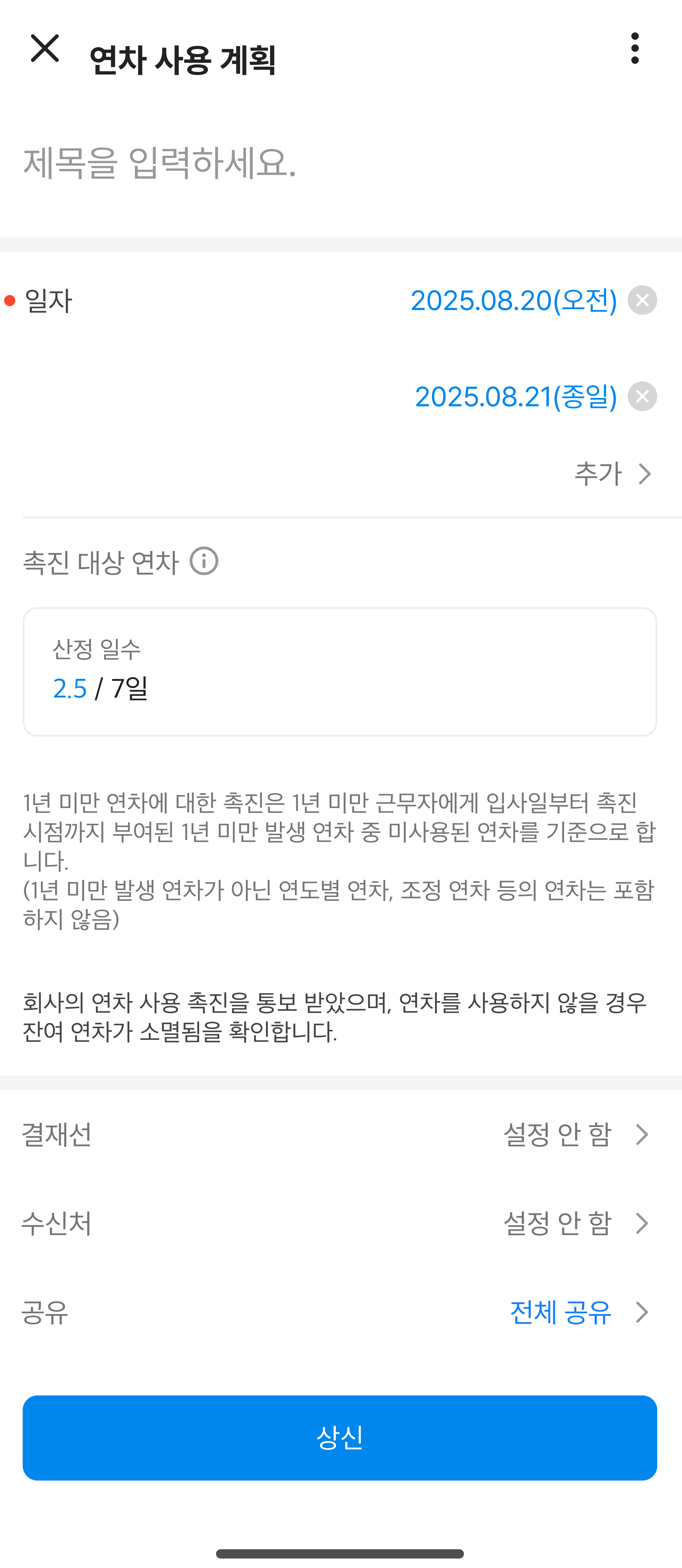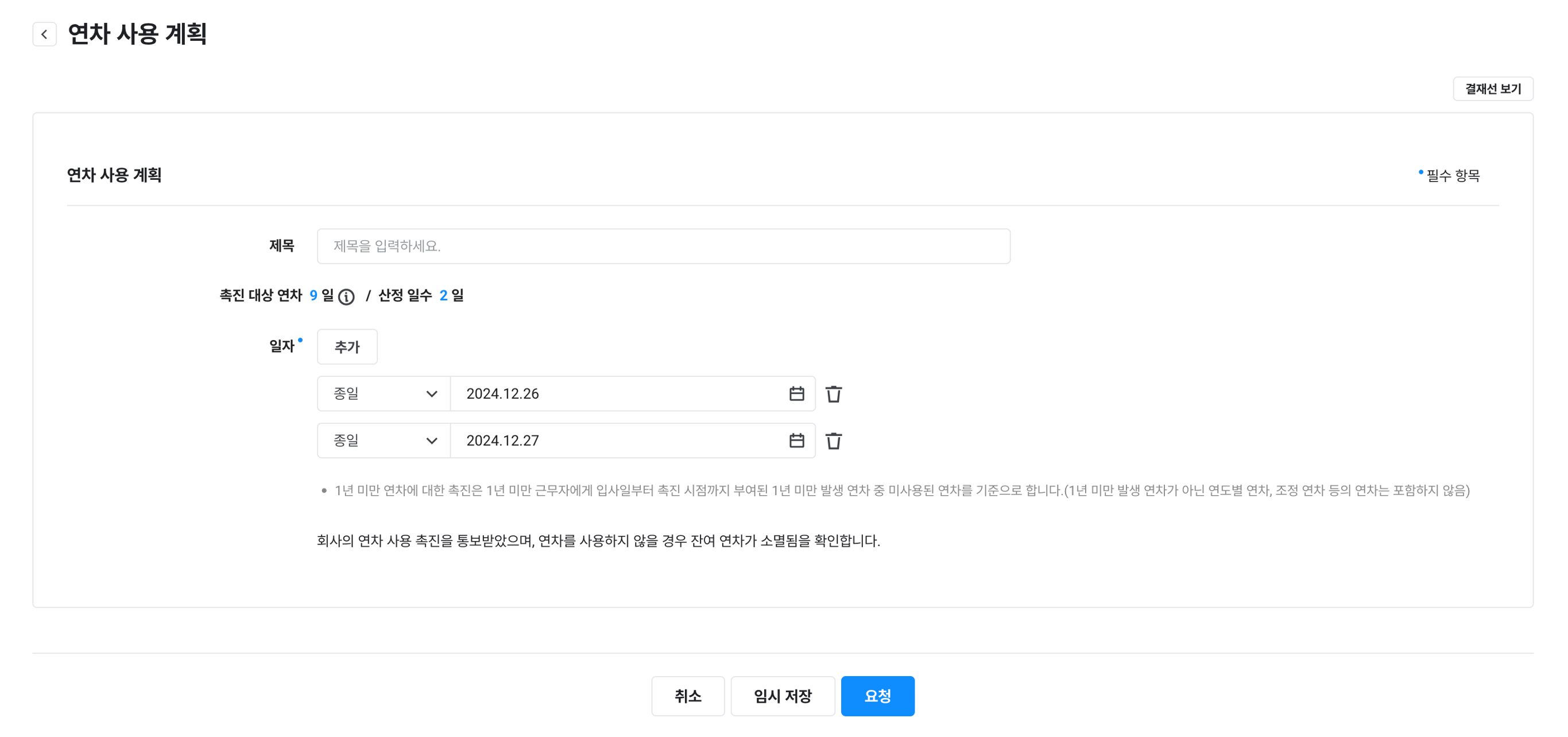 - 종일 단위: 종일 단위 휴가만 신청할 수 있습니다.