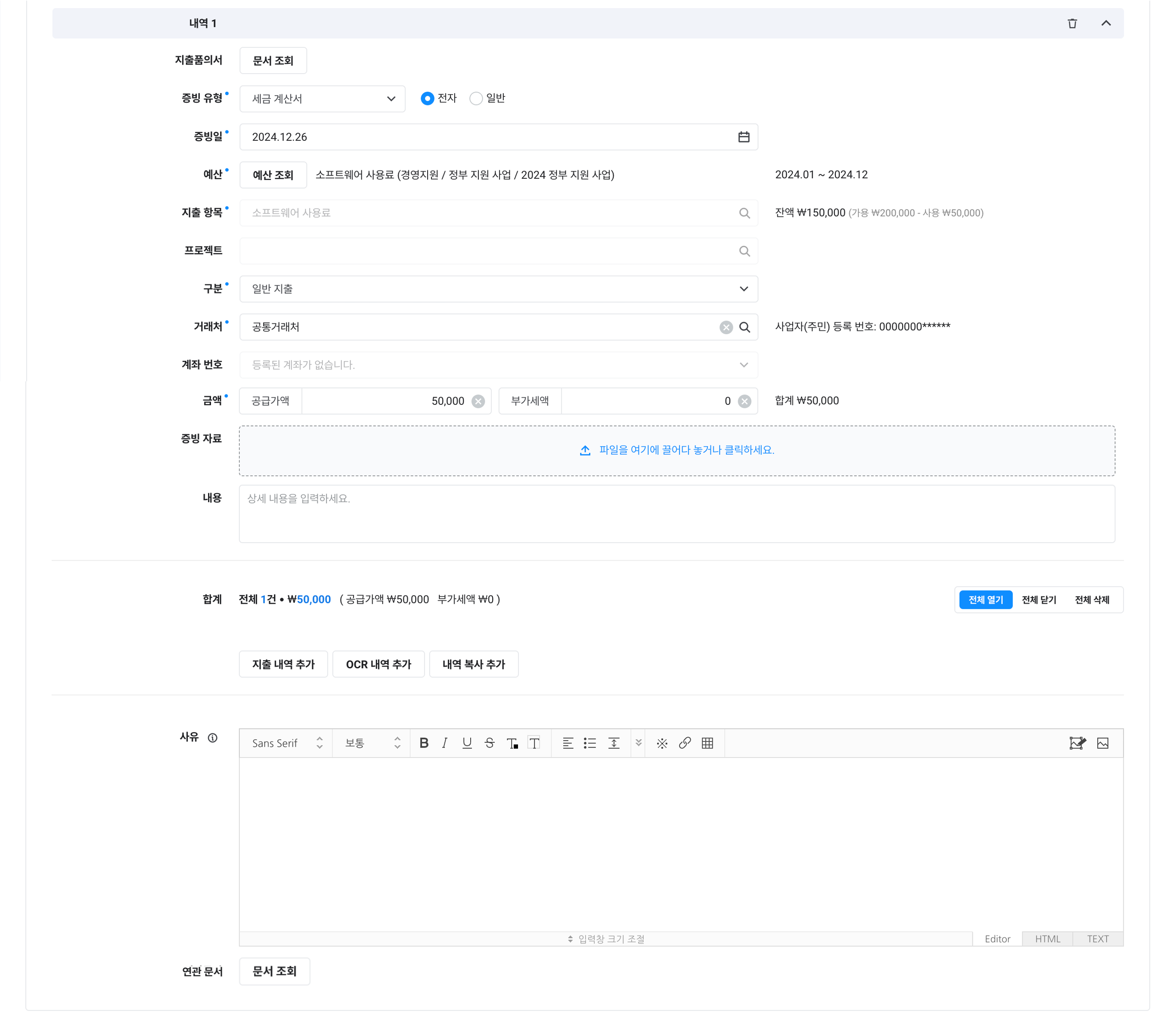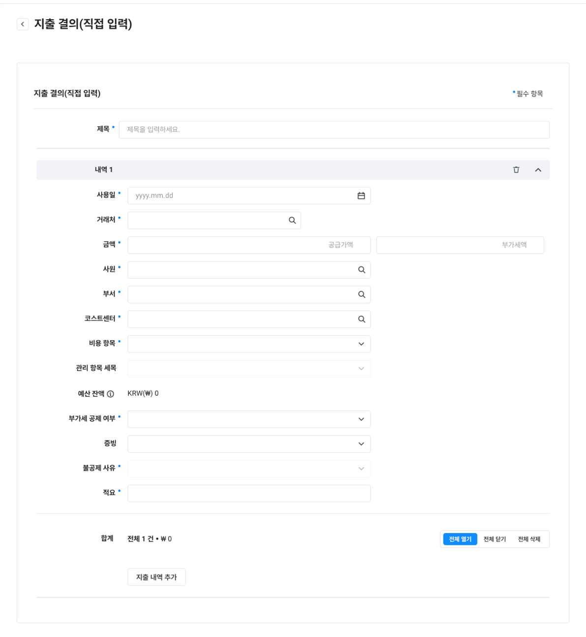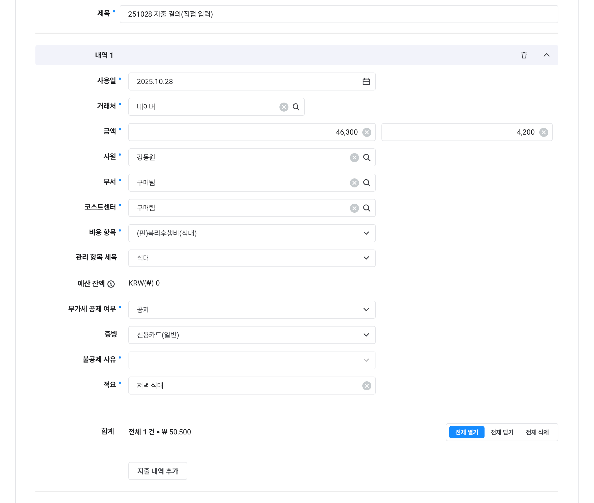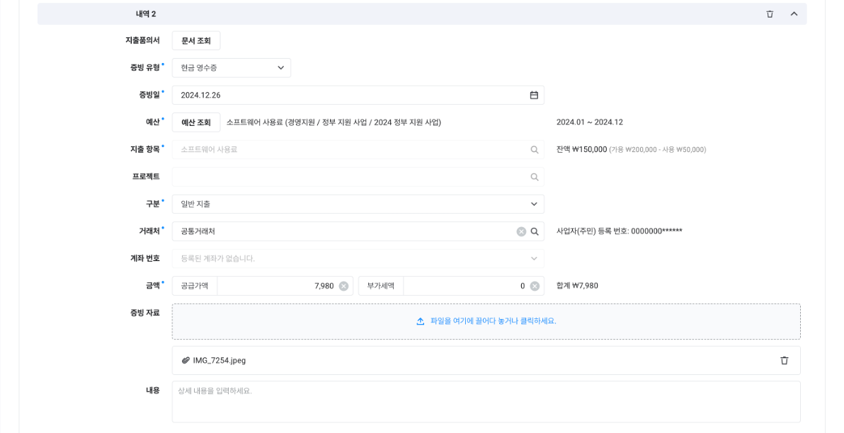 제목, 예산, 지출 항목, 증빙 유형, 거래처, 계좌, 증빙일, 금액, 내용, 연관 문서 |