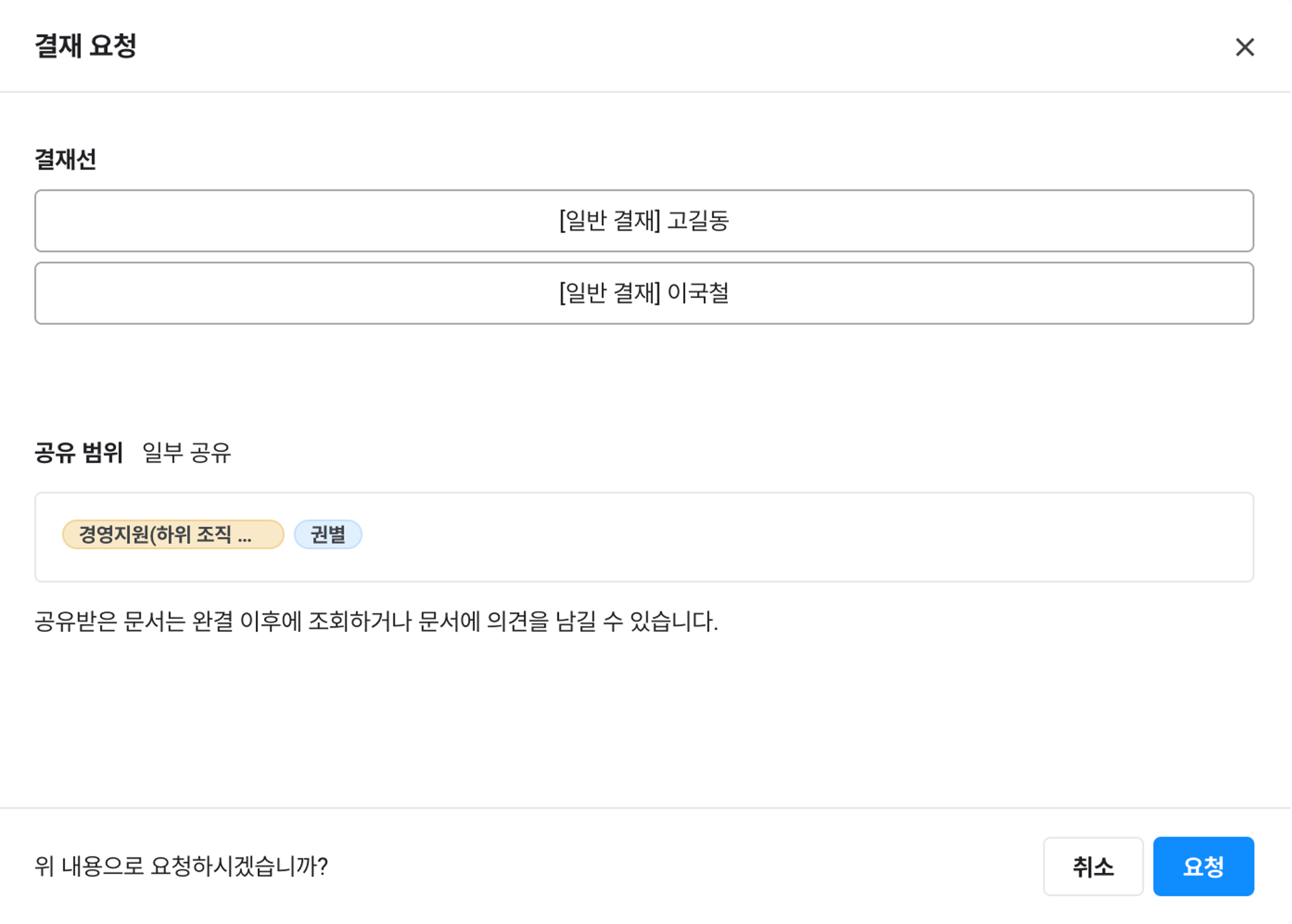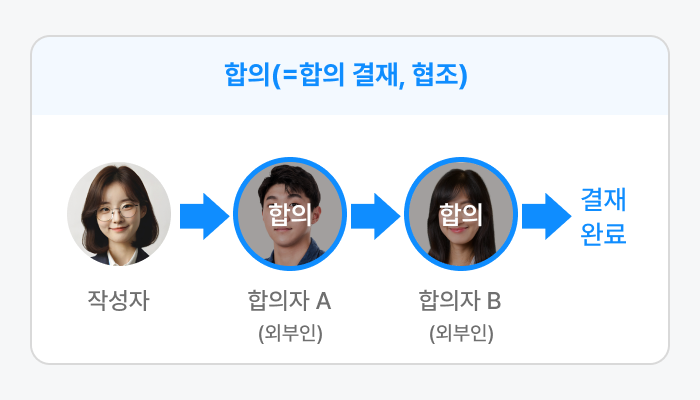 - 결재 시점 기준의 임의의 부서 소속 사원이 결재할 수 있습니다. 자세한 내용은 문서 결재를 참고해 주십시오.