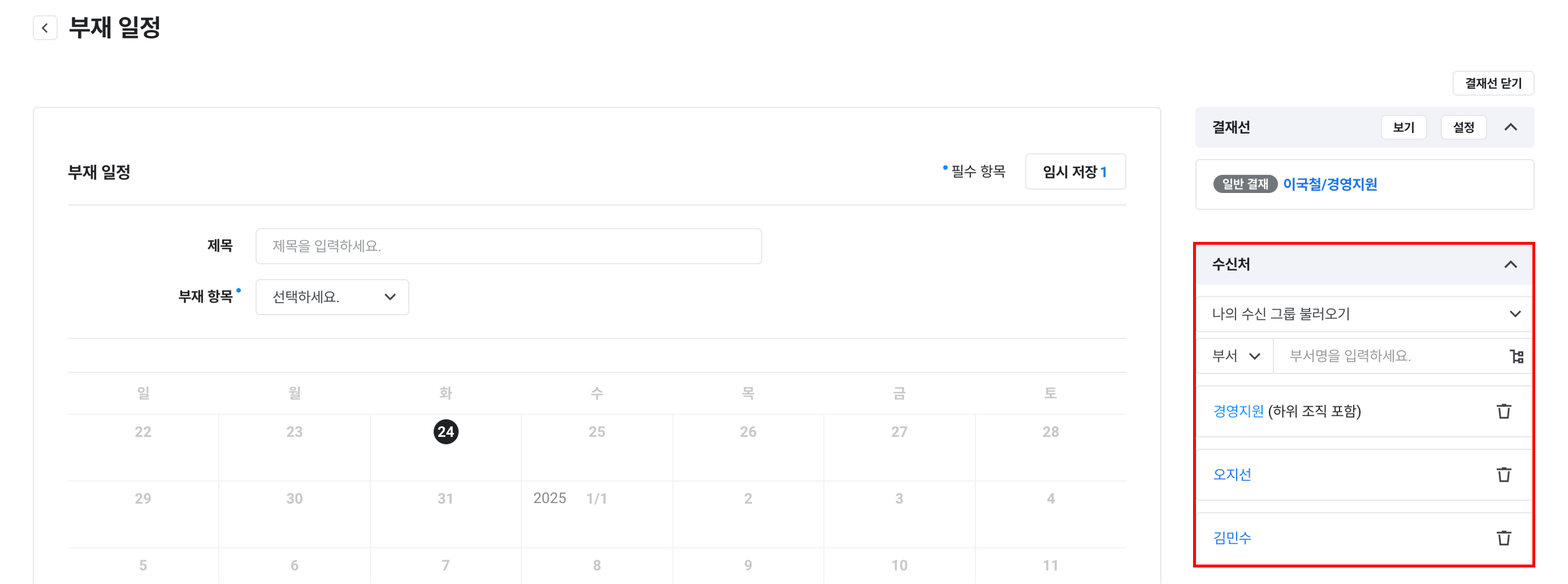 - '결재 > 나의 결재선' 메뉴에 미리 설정된 유효한 결재선 그룹이 없거나 '결재 관리 > 서식 관리 > 결재선 설정'에 설정해 둔 결재선이 있을 때 '나의 결재선 그룹 불러오기'는 표시되지 않습니다.