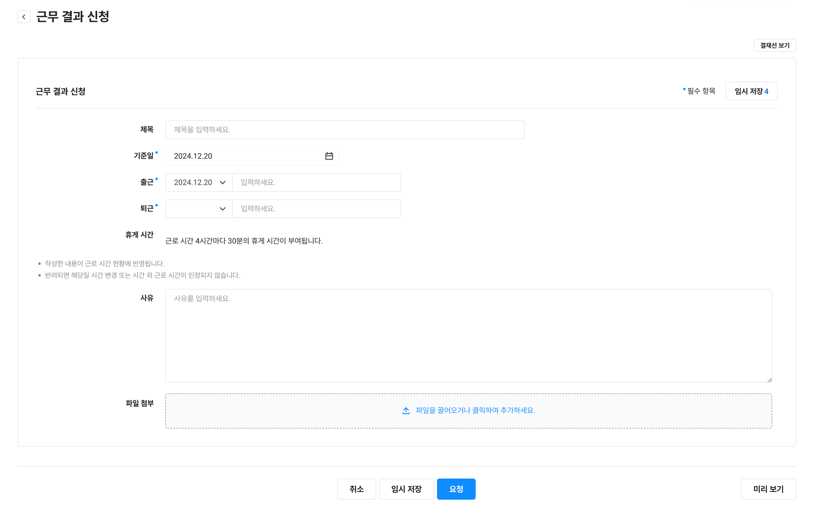 - 근무 결과 신청 문서를 저장하면 결재가 완료되기 전이라도 결재가 승인된 것으로 간주해 '내 업무 > 근태 관리 > 근로 시간 현황'에 신청한 시간이 반영됩니다. 결재가 반려될 경우, 해당 일 출근 및 퇴근 또는 휴가, 외부 근무 시간 변경, 일반 근로 시간 외 근무 시간이 인정되지 않고 다시 변경됩니다.