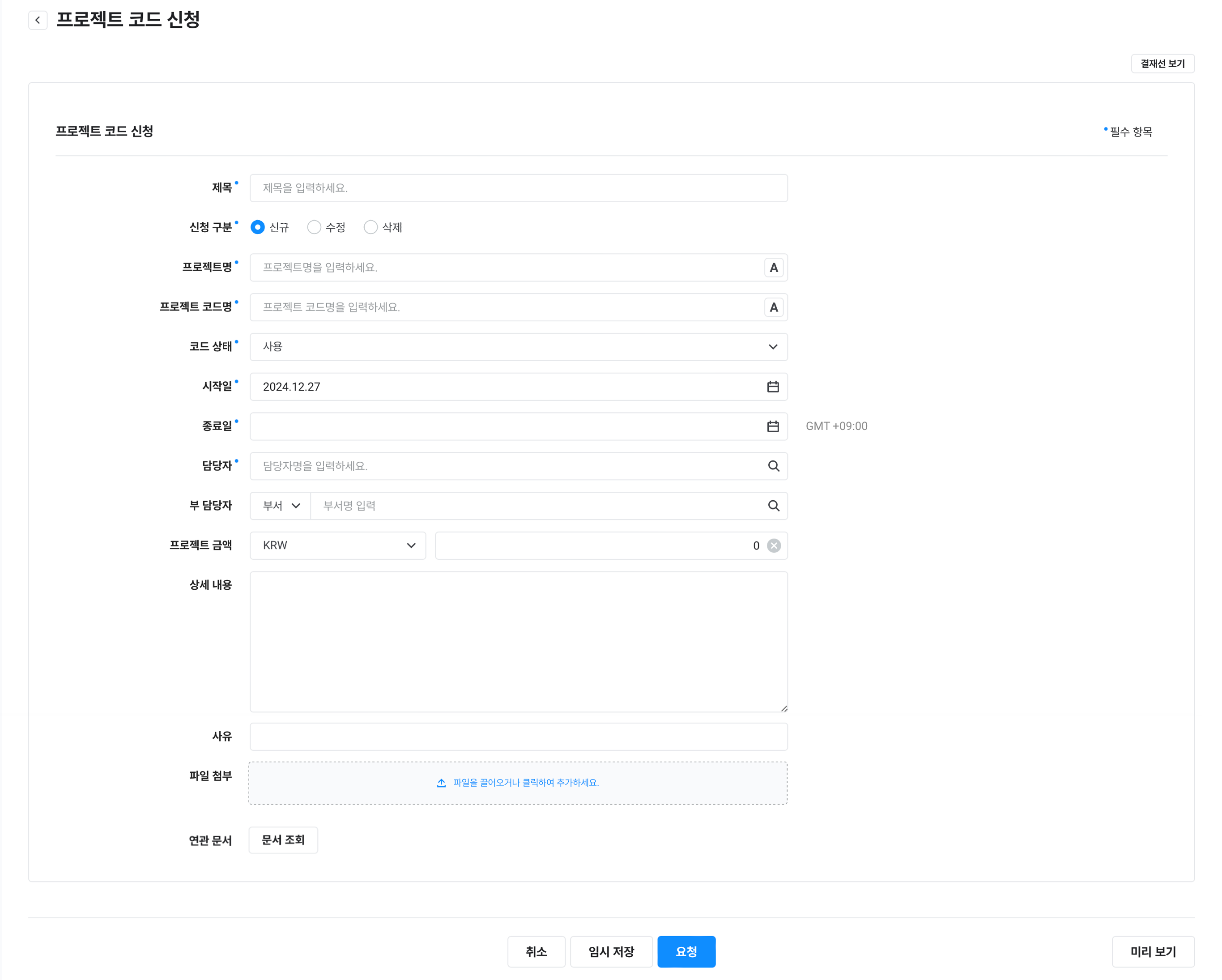 - 프로젝트 코드 신청 서식은 프로젝트 코드를 결재 연동 설정한 경우 제공되는 서식입니다.
