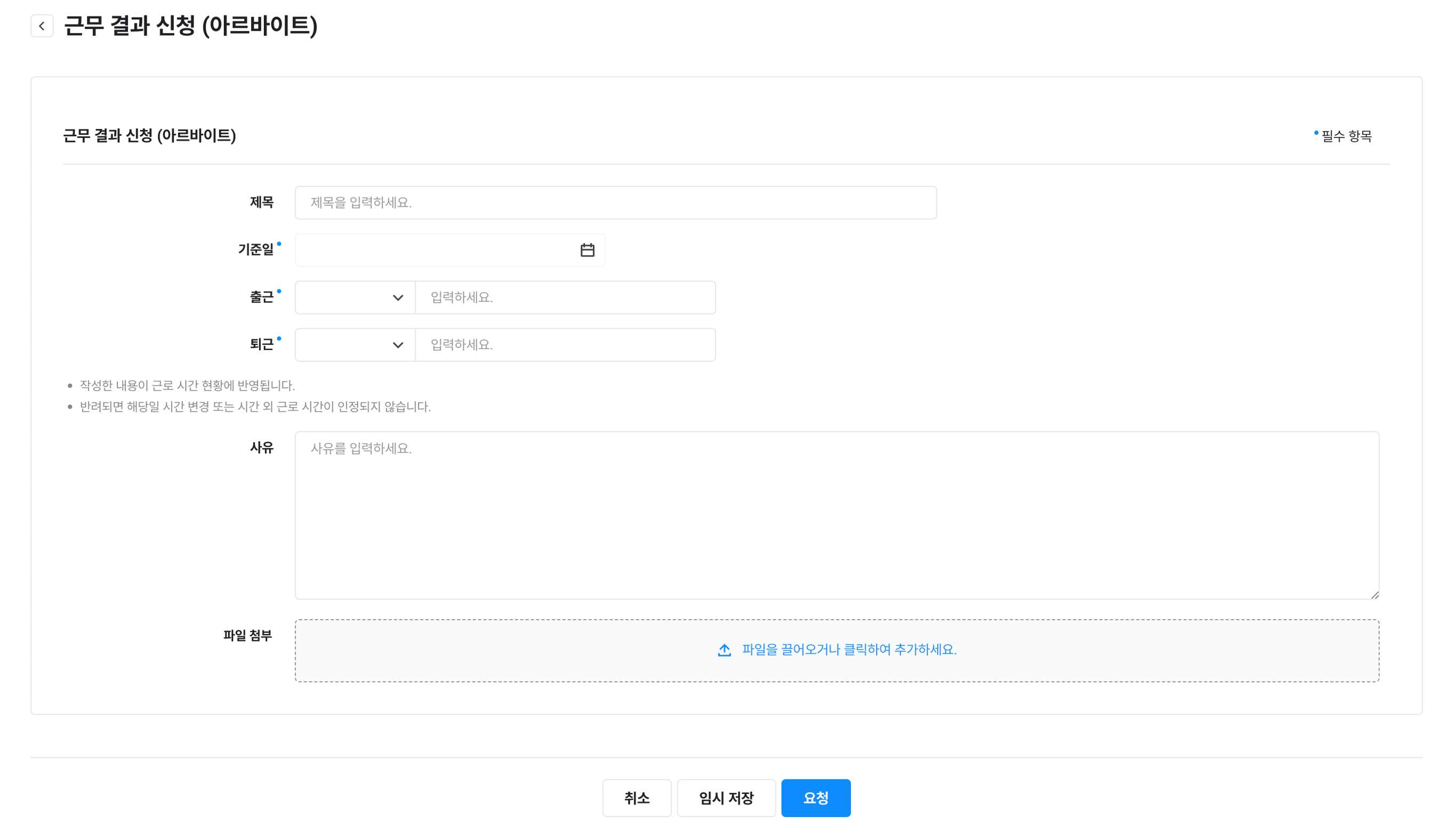 제목, 사유, 파일 첨부, 출근, 퇴근, 휴게, 외부 근무(단, 출근, 퇴근, 휴게, 외부 근무 항목은 타 항목 변경으로 인해 초기화 시 유지 안됨) |