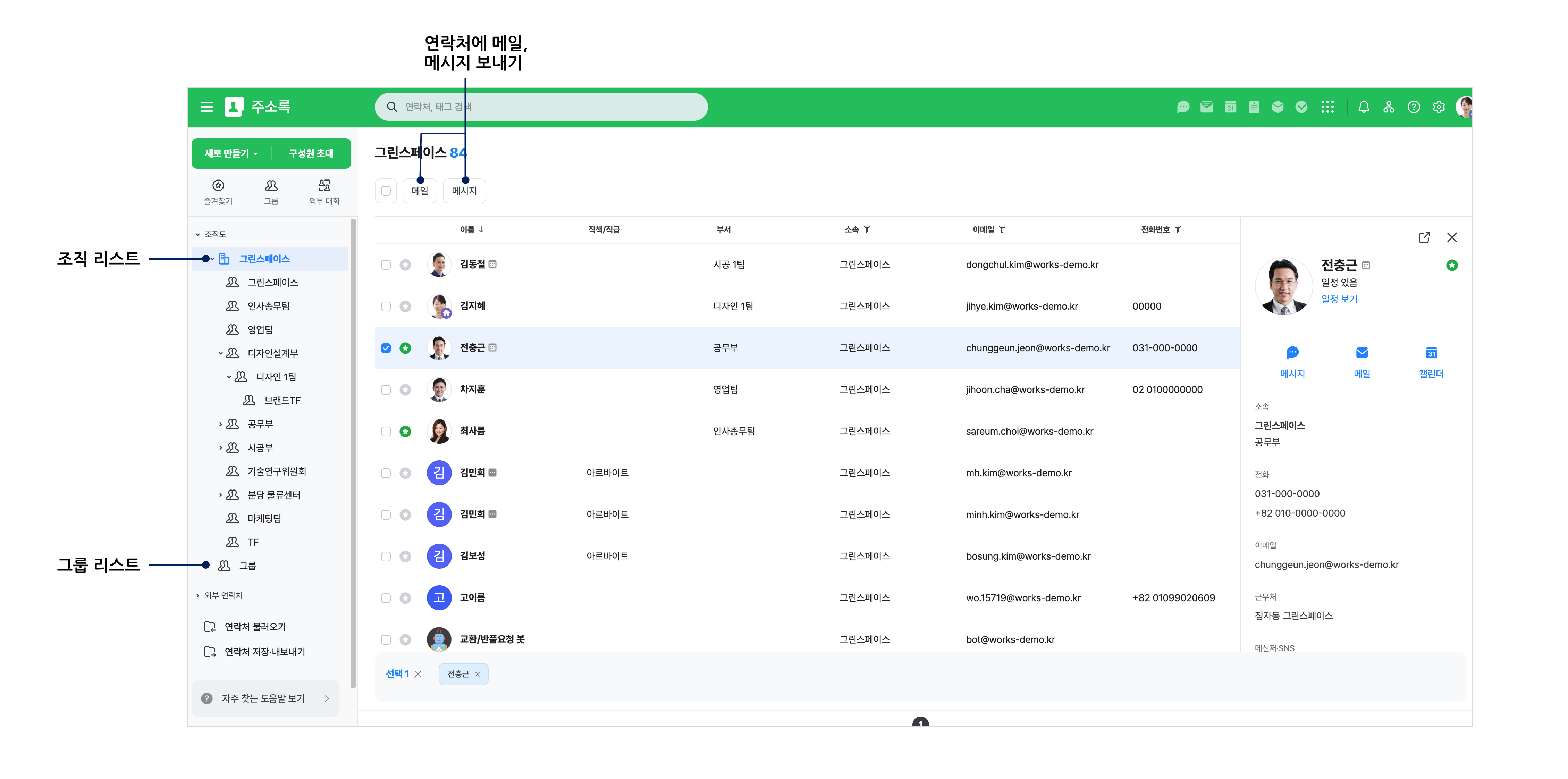 - 왼쪽 메뉴에서 전체 구성원을 확인하고 싶다면 회사명을, 특정 부서의 구성원을 확인하고 싶다면 부서명을 클릭합니다.