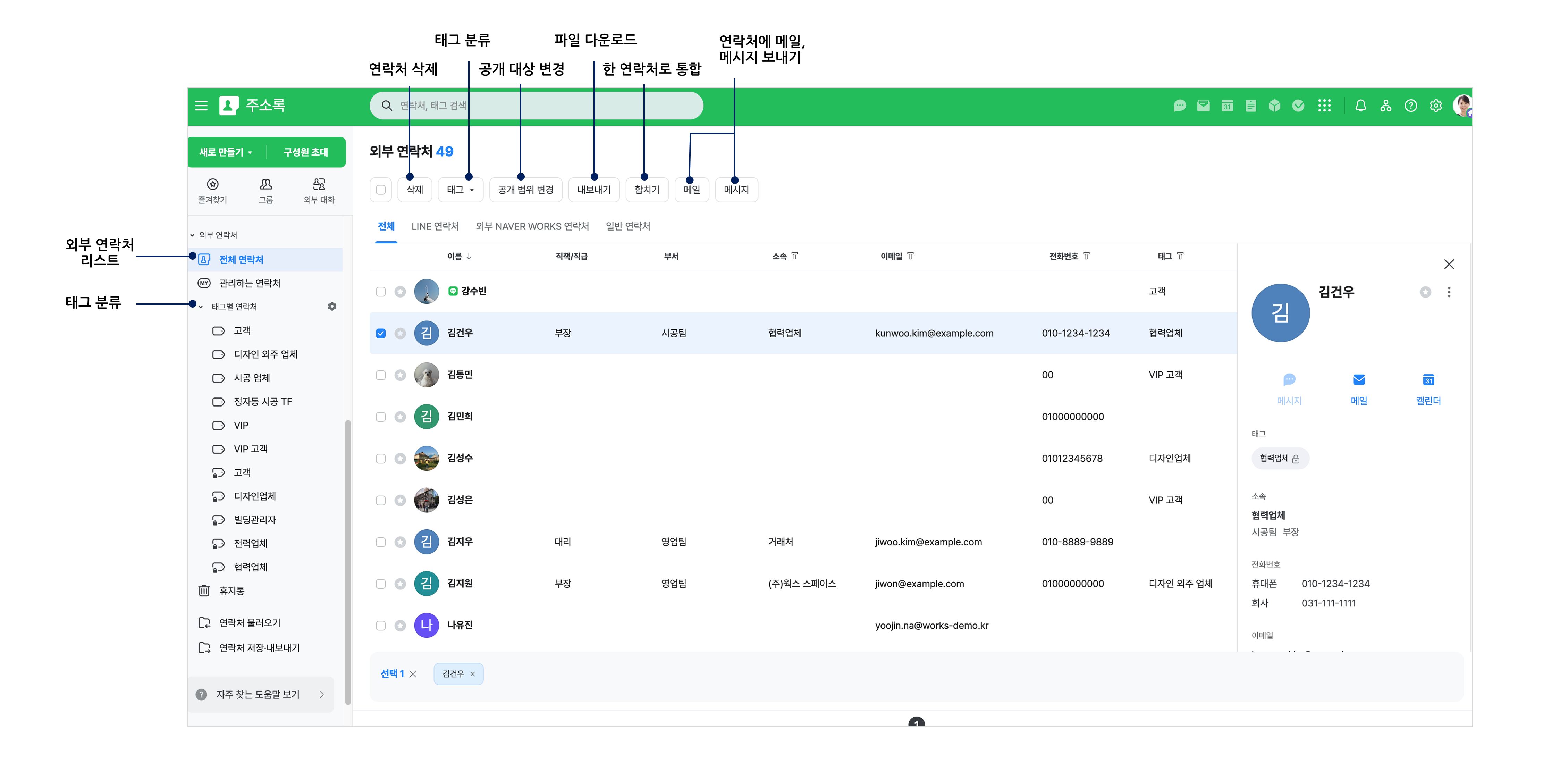 외부 연락처를 태그별로 분류하여 확인할 수 있습니다.