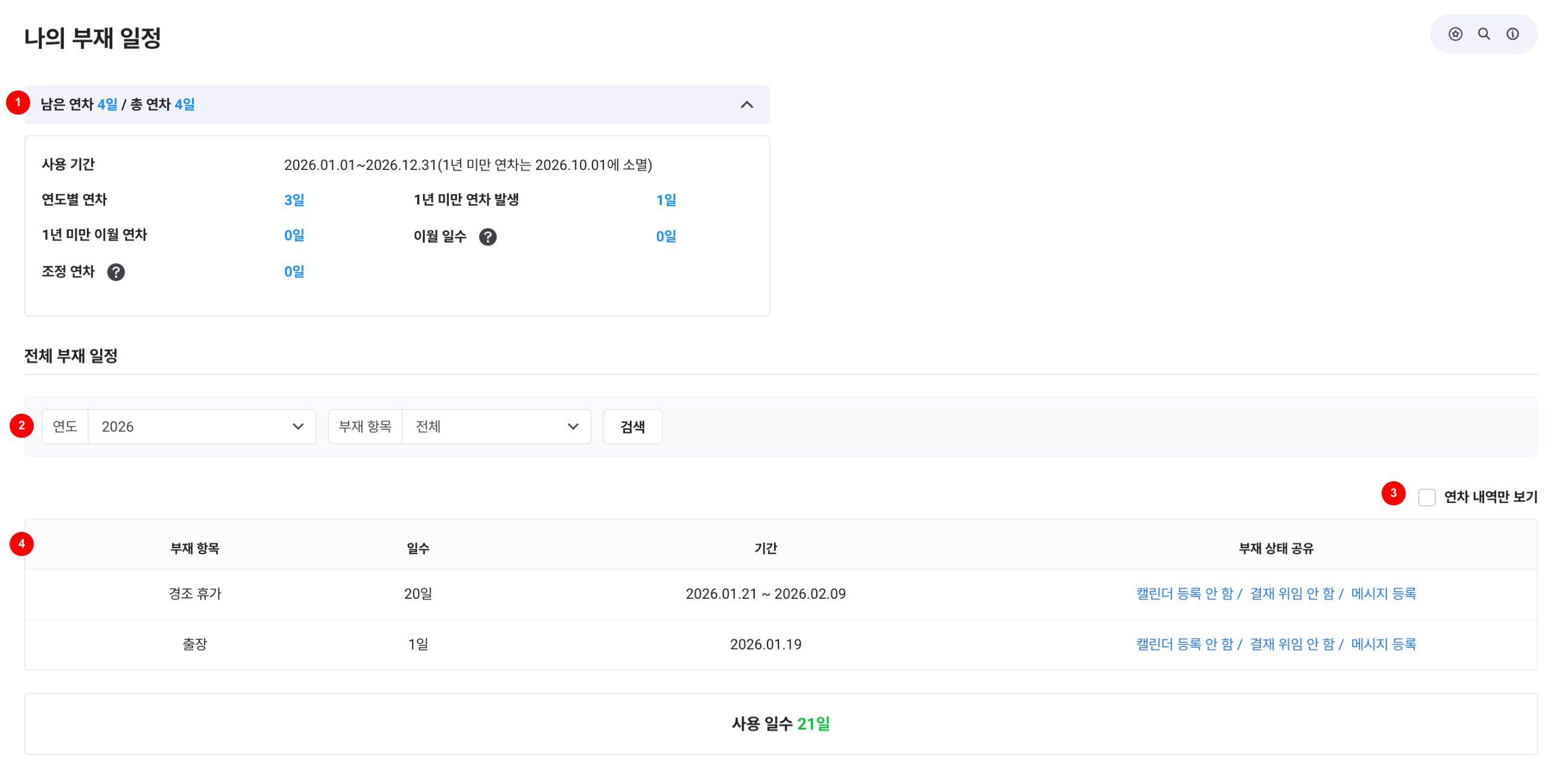 나의 부재 일정 화면은 다음과 같이 구성되어 있습니다.