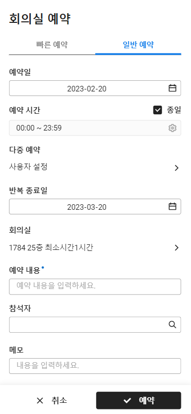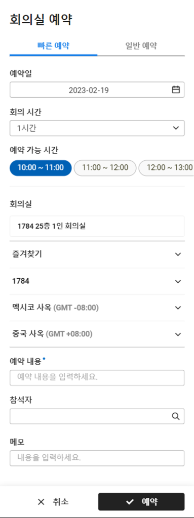 회의실을 빠른 예약 또는 일반 예약 방식으로 예약할 수 있습니다.