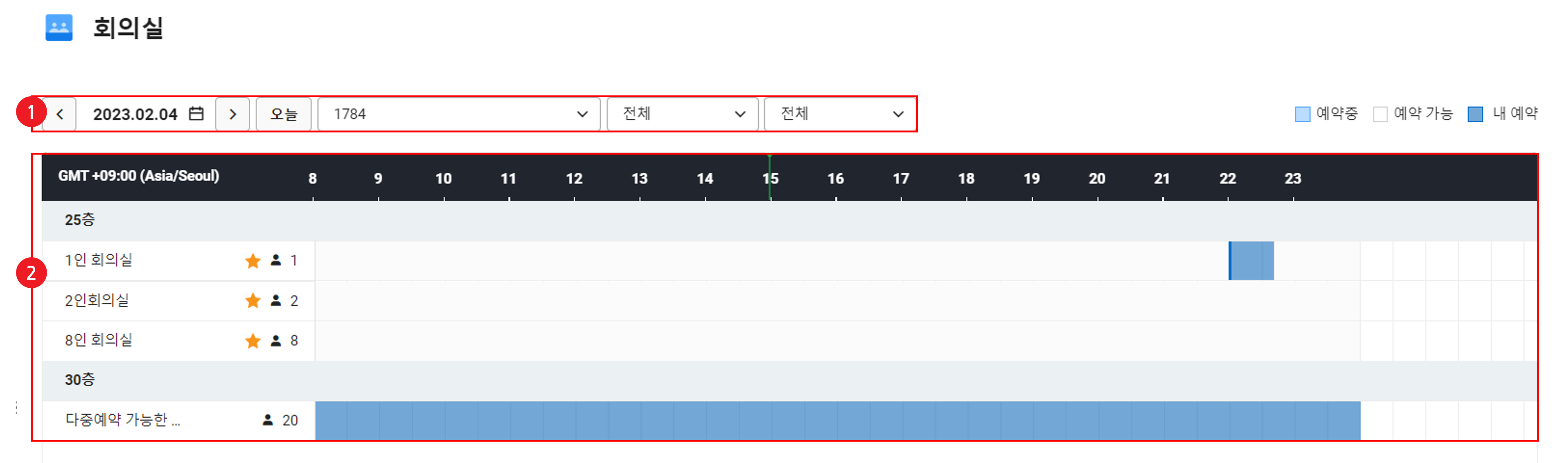 - 회의실 항목에 예약 중인 회의실이 표시됩니다. 회의실의 예약 가능 여부를 확인합니다.