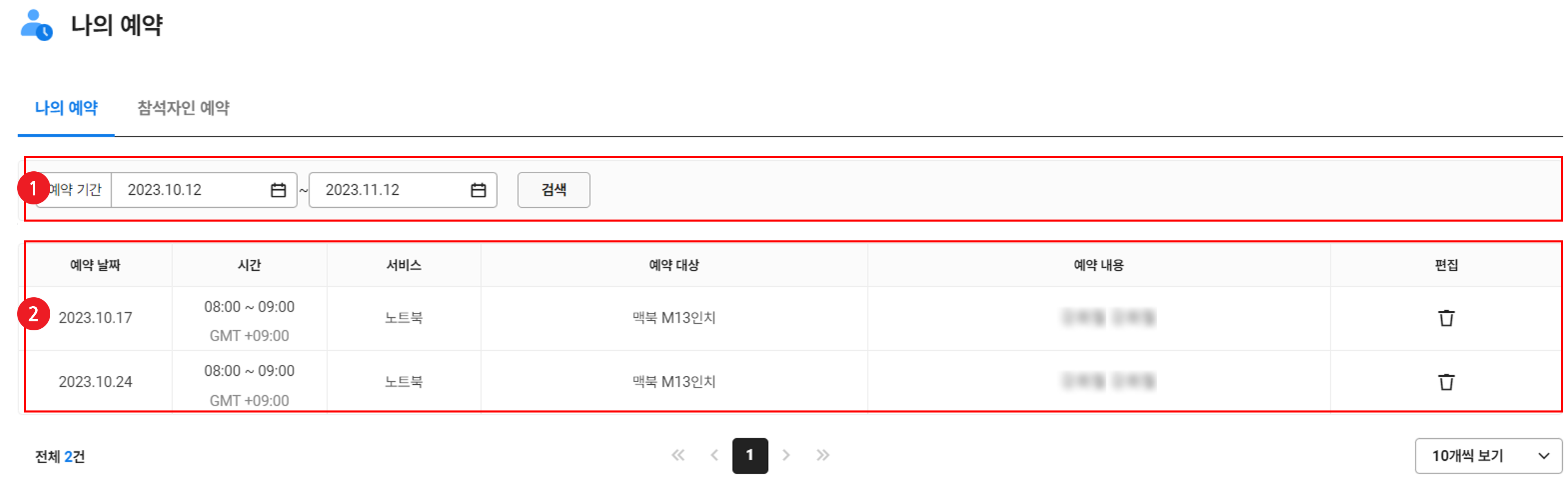 | ① 검색 영역 | 예약 기간을 조건으로 검색 |