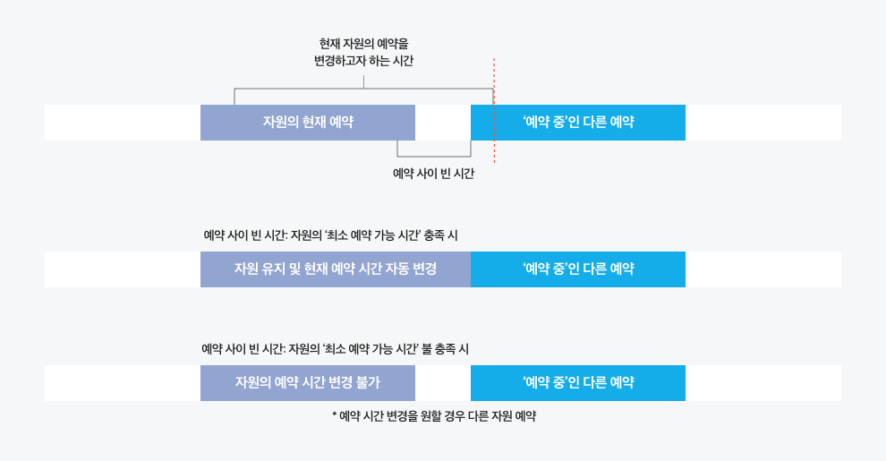 - 변경하고자 하는 시간이 '예약 중' 상태인 다른 예약과 일부 겹치는 경우, 비어 있는 시간이 자원의 최소 예약 가능 시간 충족 시 자동으로 최소 예약 시간만큼 변경되어 선택됩니다.이 경우 현재 자원을 유지할 수 있습니다.