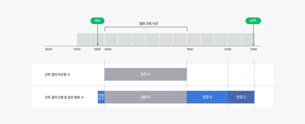 - 퇴근 시간 이후인 24시(자정)까지 추가 근무를 하고 퇴근을 체크('OFF' 버튼 클릭)하였더라도, 근무 결과 신청이 승인되지 않은 경우 일반 근로 종료 시간인 18시 이후의 약 6시간은 근로 시간으로 인정되지 않습니다.(야간 시간 기록도 함께 인정되지 않습니다.)