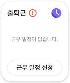 - 시차 근무제, 선택 근무제에서 '근무 일정 상신'을 적용받는 사원은 출퇴근 체크 당일에 근무 일정이 없는 경우 출퇴근을 체크할 수 없습니다. 근무 일정을 신청하여 승인을 받아야 출퇴근 체크가 가능합니다. '근무 일정 신청'을 탭하여 신청해 주세요.