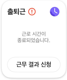 - 퇴근을 체크하지 않으면 근로 시간을 산정할 수 없습니다. 퇴근을 체크하지 않고 퇴근했을 경우, '근무 결과 신청 서식'을 작성하여 승인을 받아야 근로 시간을 인정받을 수 있습니다.