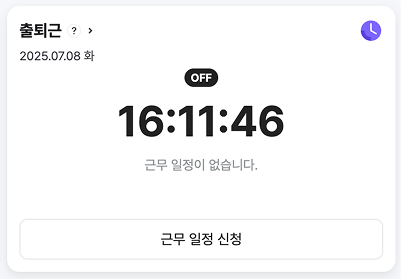 사용자 개인의 근무 스케줄에 휴일 또는 휴무일로 설정된 날에는 출/퇴근 버튼이 표시되지 않습니다.