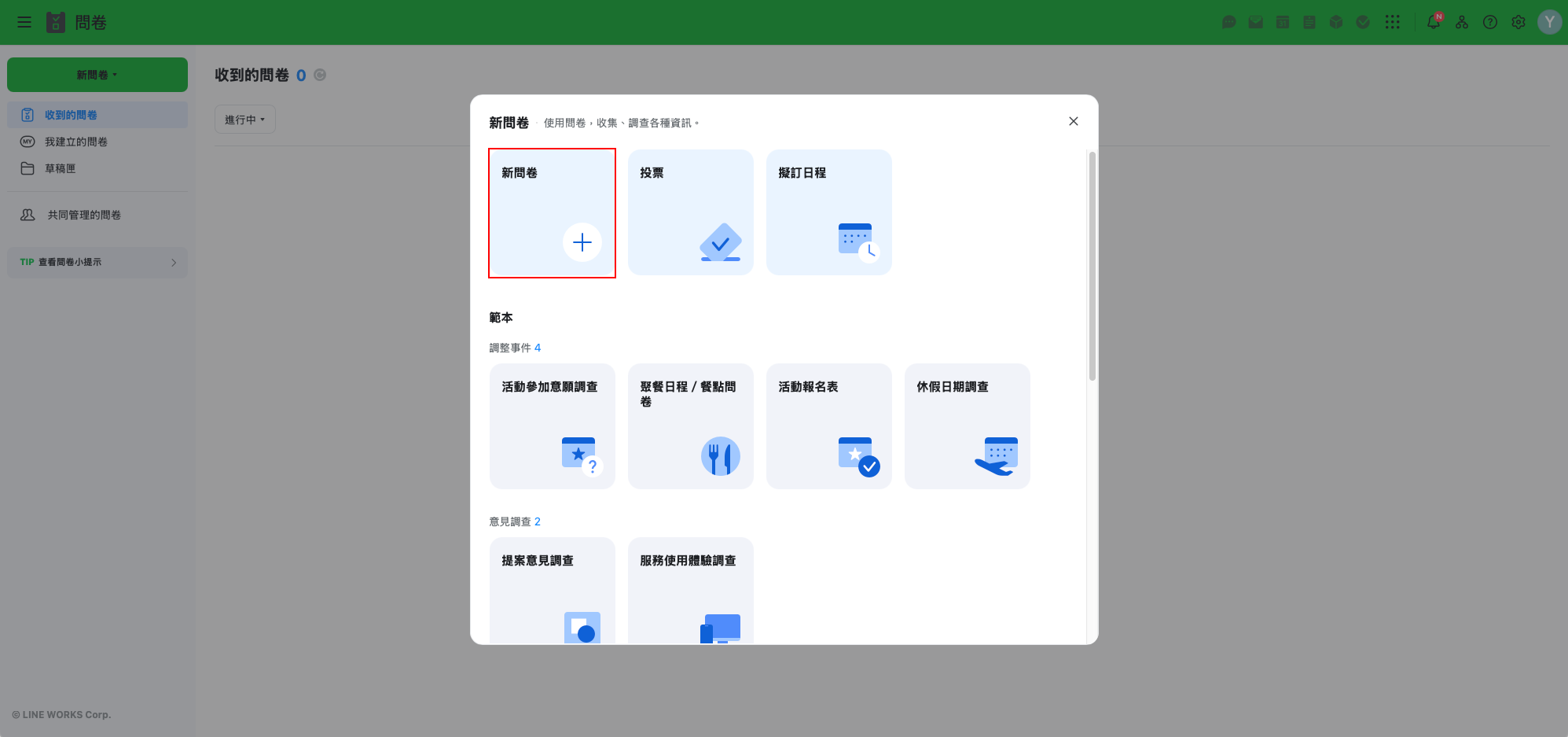 您可以將員工安全狀況回報或活動參加意願調查等,業務常用的問卷模式建立為範本。