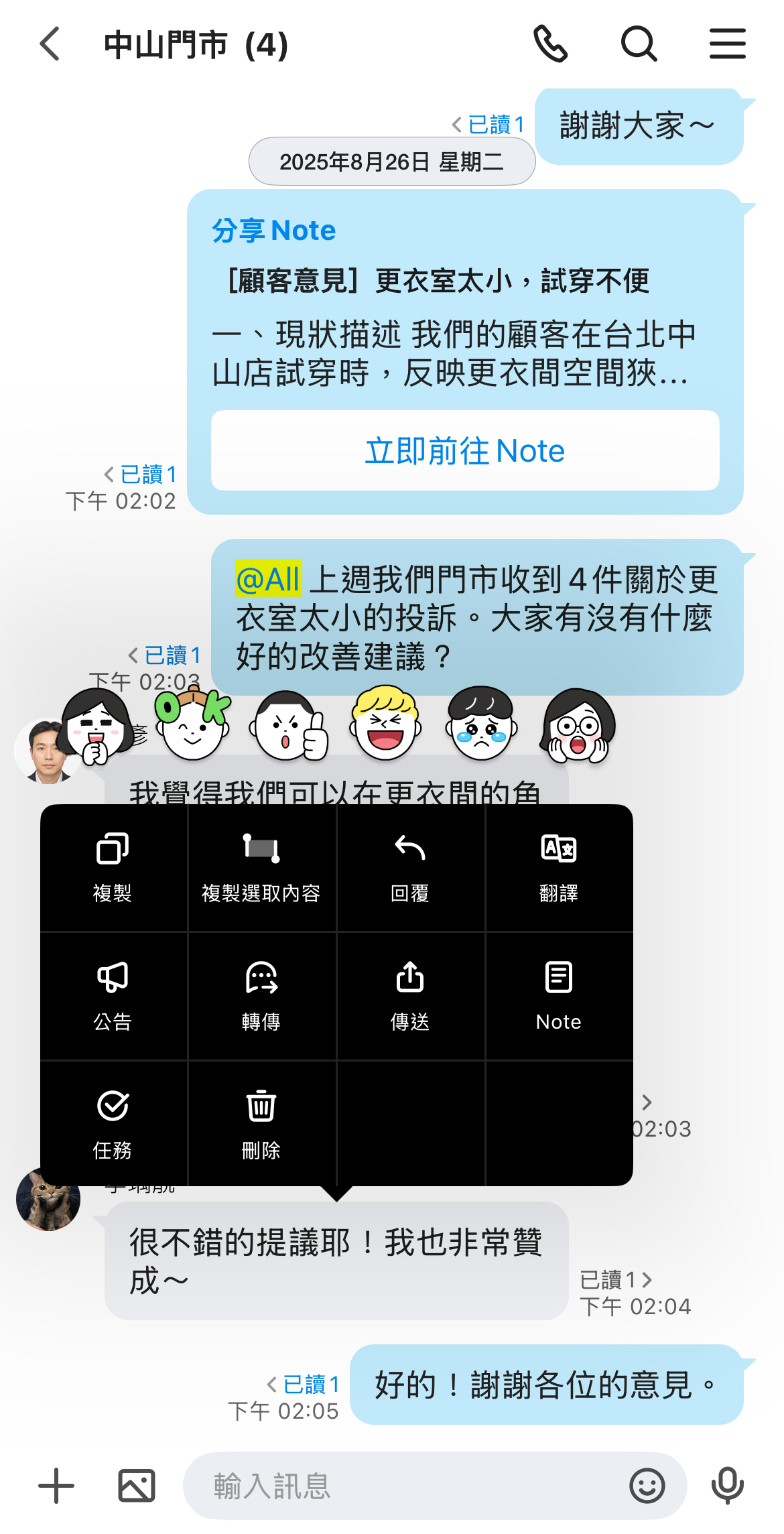 不需傳送訊息或貼圖,可針對個別訊息留下表情符號,便能輕鬆表示共鳴或表達意見。