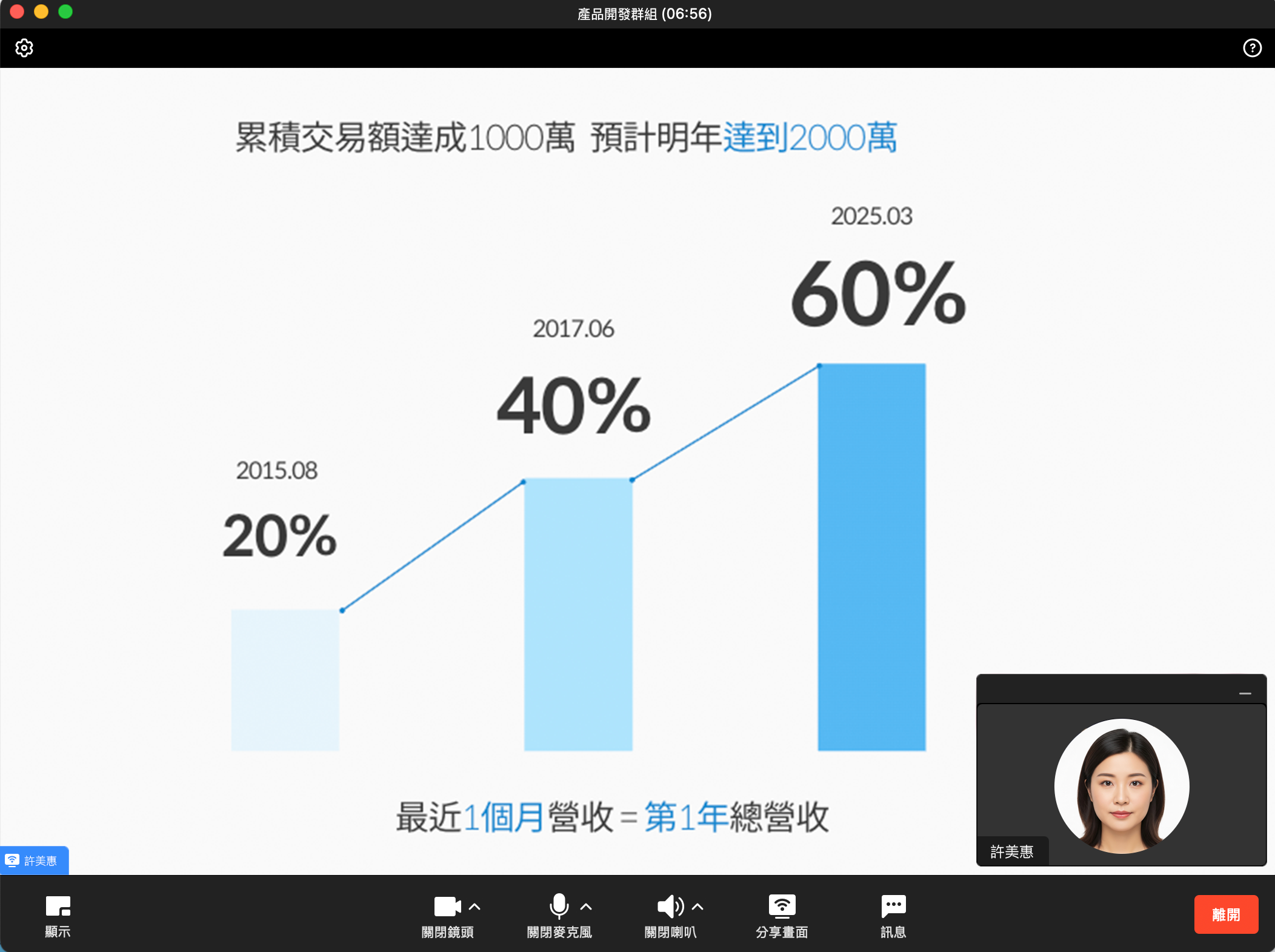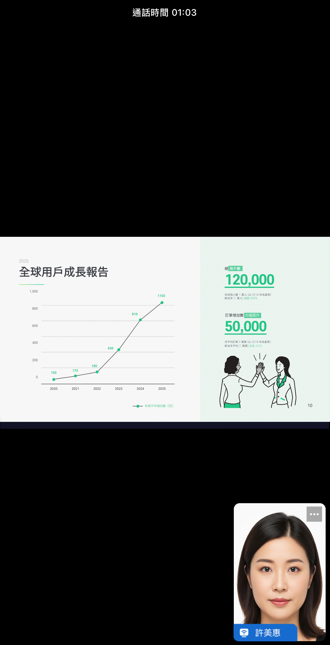 畫面分享開始後,螢幕畫面上方會出現功能選單,右下角則會顯示通話畫面。